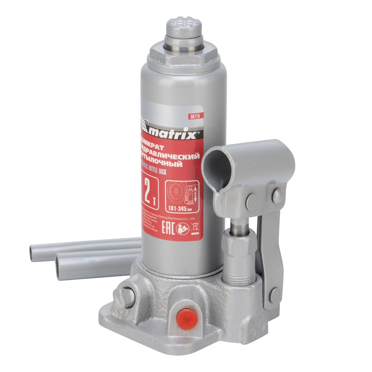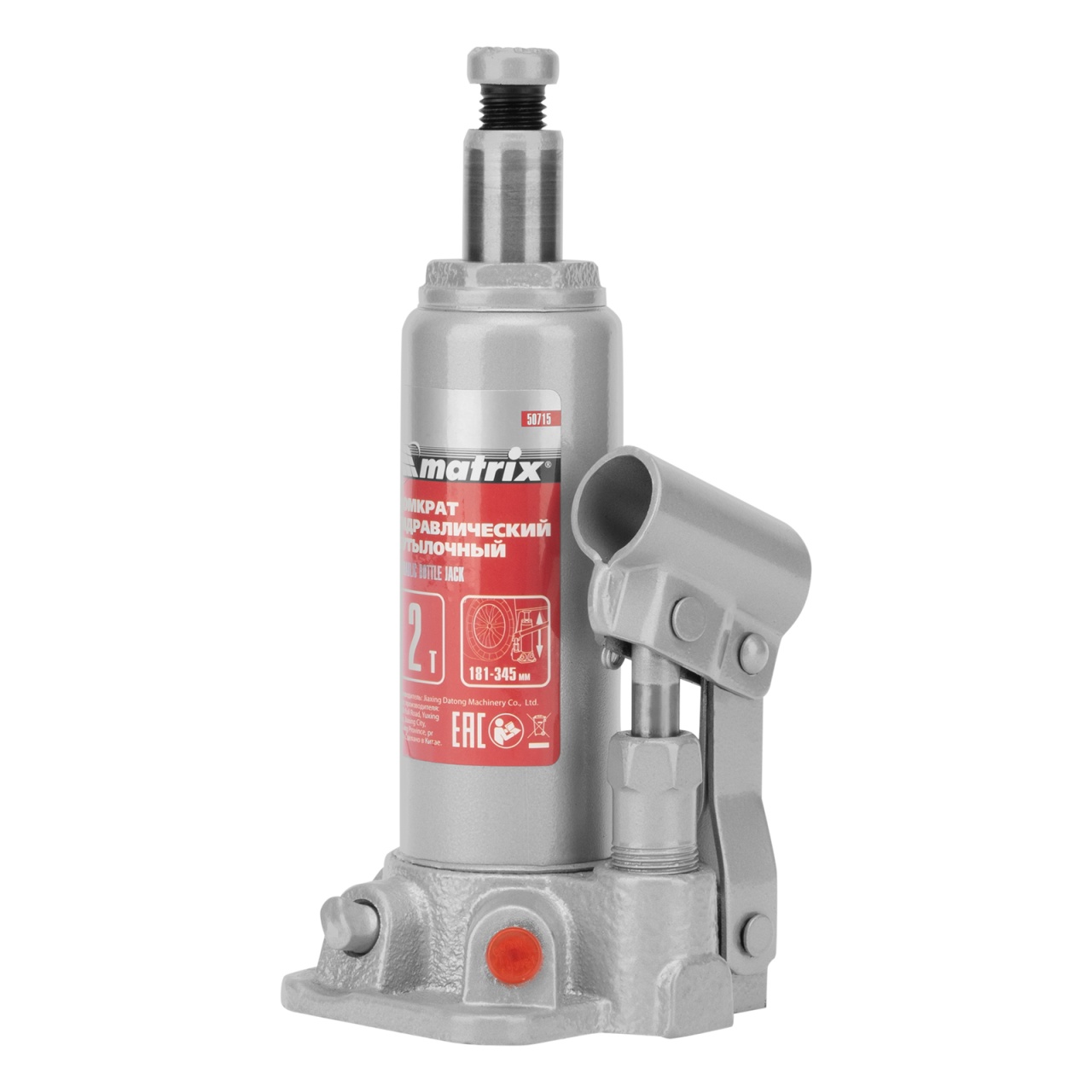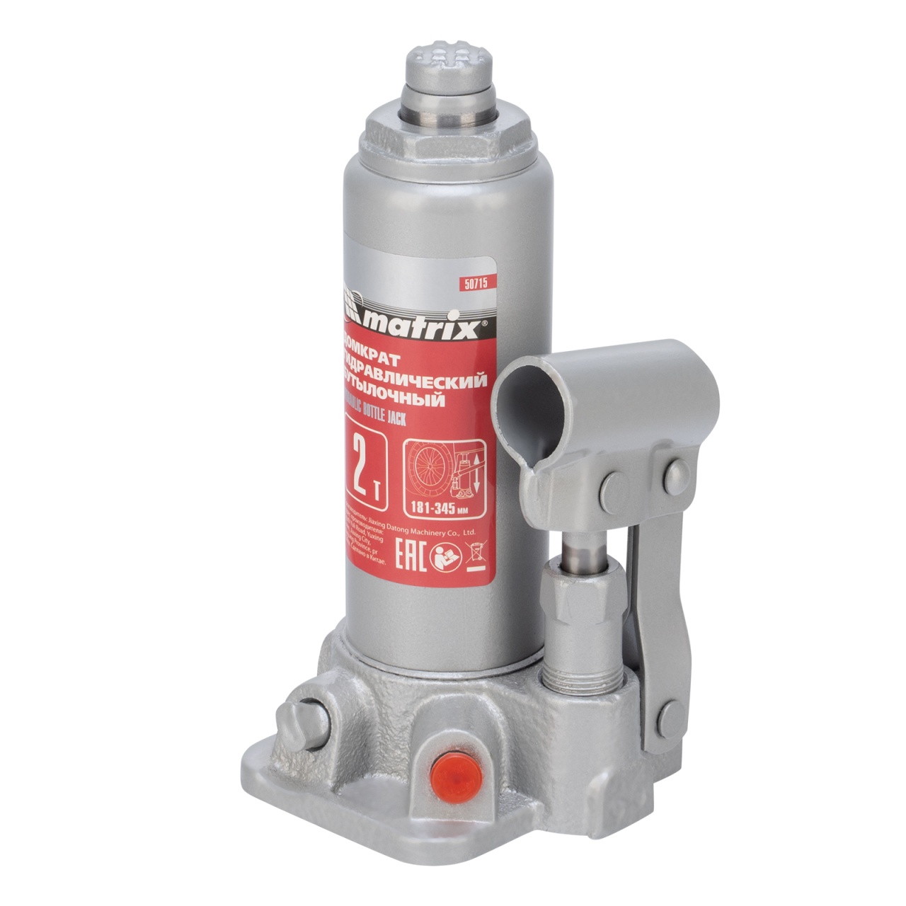 Домкрат гидравлический бутылочный Matrix 50715 используется для поднятия грузов массой до 2 т на высоту 181-345 мм. Подходит для автомобилей с высоким клиренсом. Домкрат будет полезен автолюбителям в гараже и дороге, а также сотрудникам СТО.