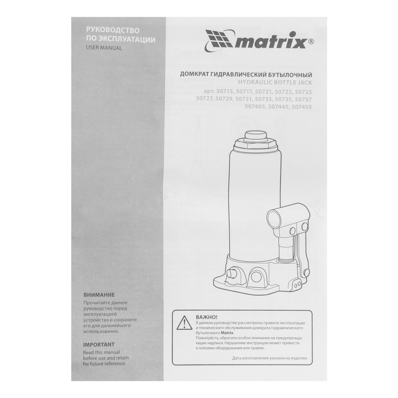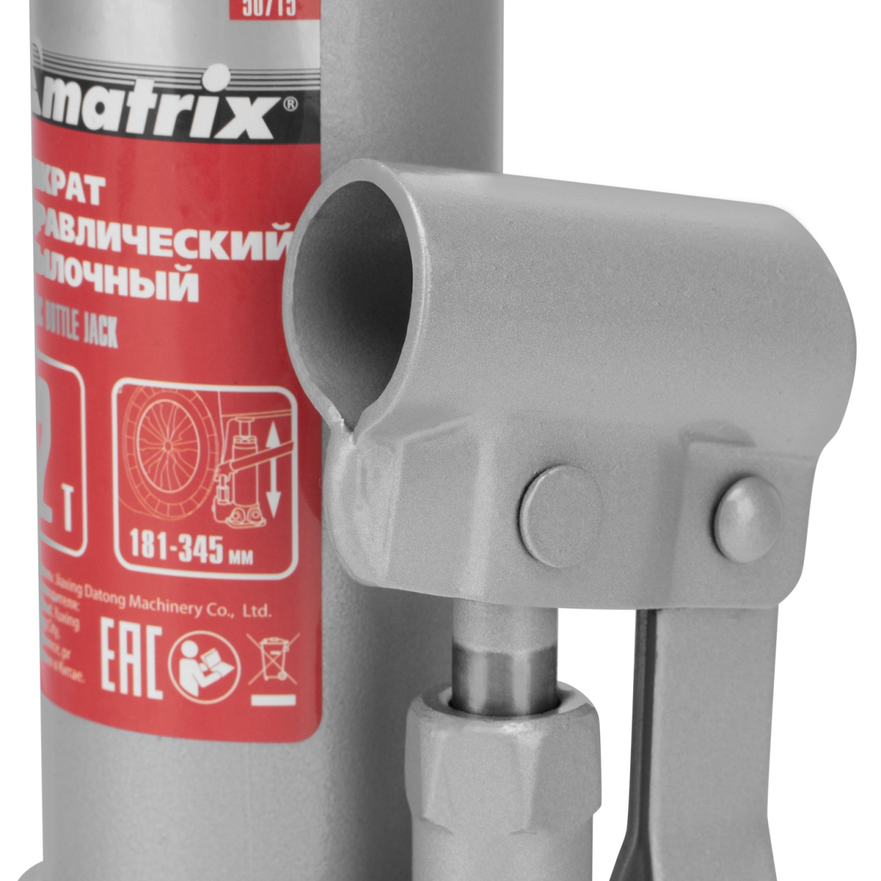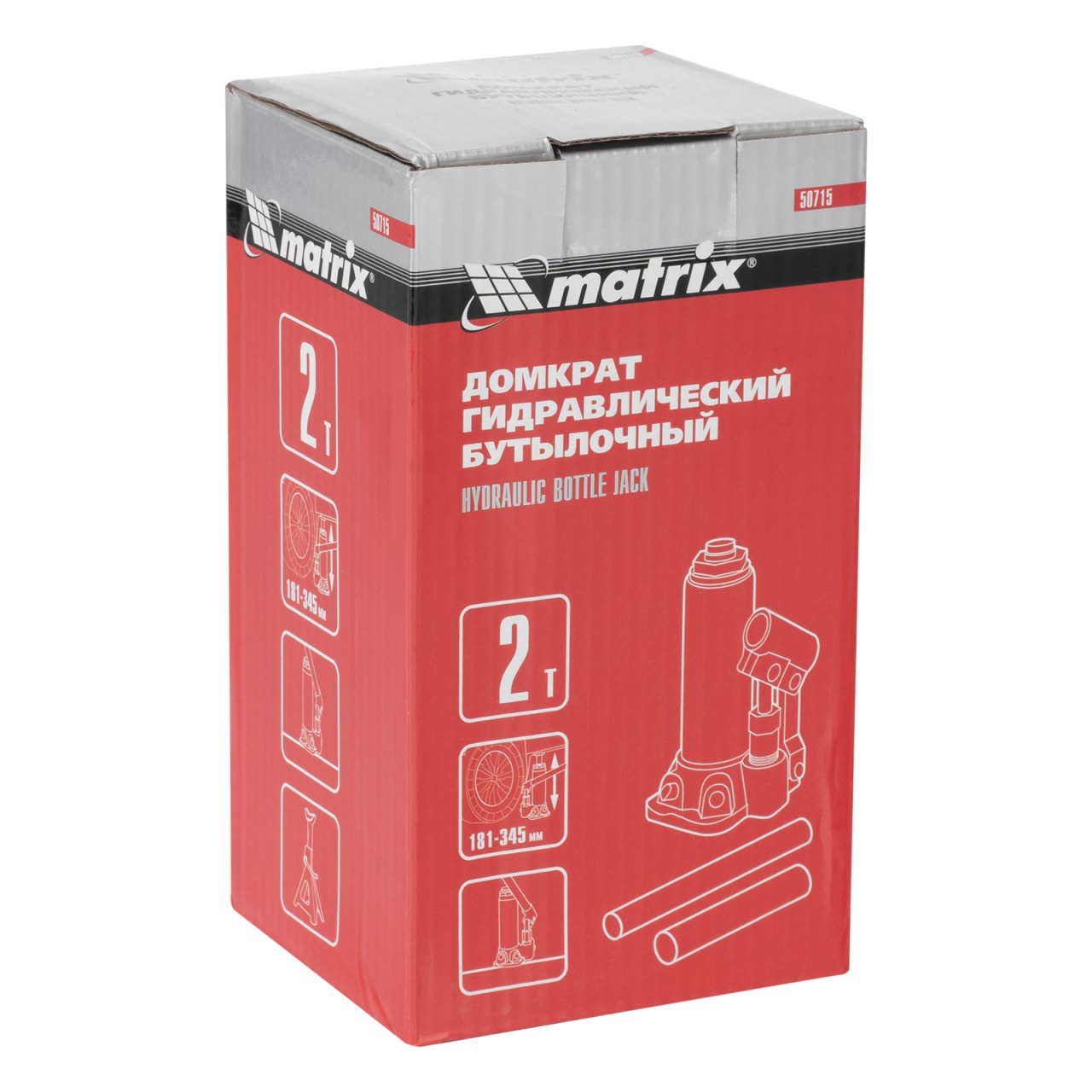 Домкрат гидравлический бутылочный Matrix 50715 используется для поднятия грузов массой до 2 т на высоту 181-345 мм. Подходит для автомобилей с высоким клиренсом. Домкрат будет полезен автолюбителям в гараже и дороге, а также сотрудникам СТО.