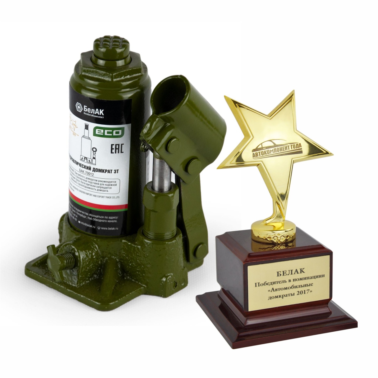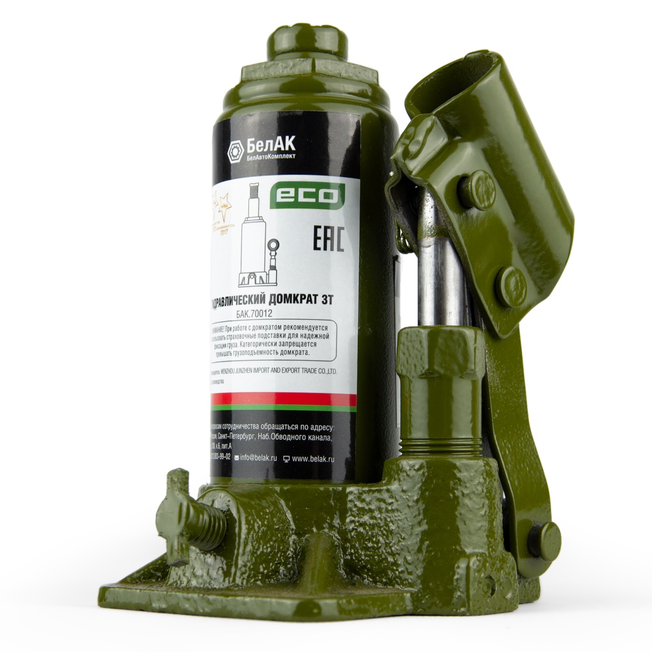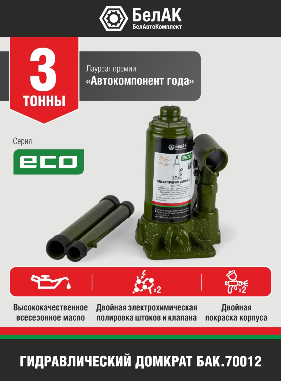 Гидравлический домкрат БелАК 3 т, ECO БАК.70012 разработан российским производителем «БелАК», награждённым двумя национальными премиями «Автокомпонент года» и «Автоаксессуар года» за высокое качество и надежность выпускаемых домкратов. Продукция «БелАК» соответствуют нормам сертификации ISO9001 и ЕАС. Домкрат ECO 3 тонны «БелАК» БАК.70012 служит для плавного и безопасного подъема автотранспорта весом не более 3 т.
