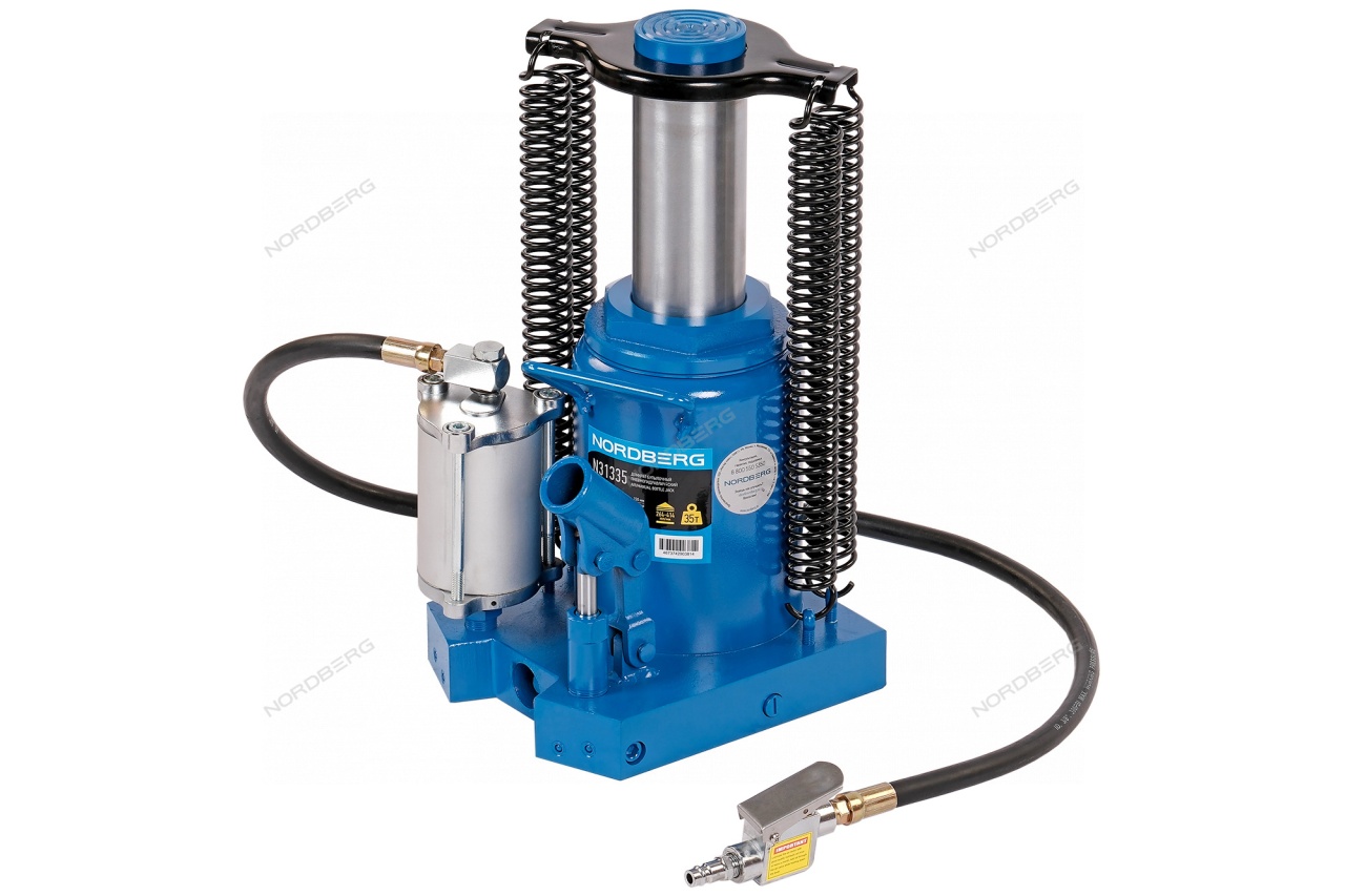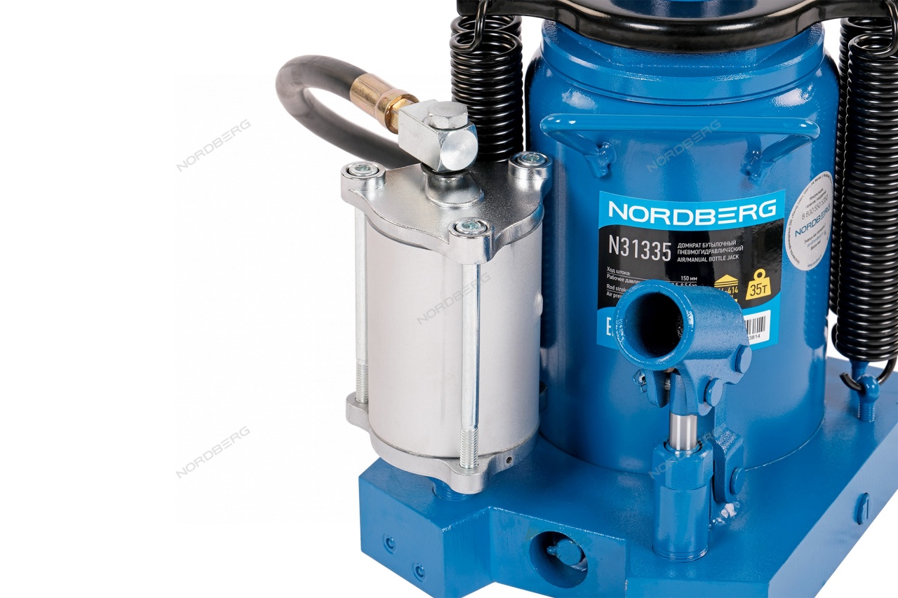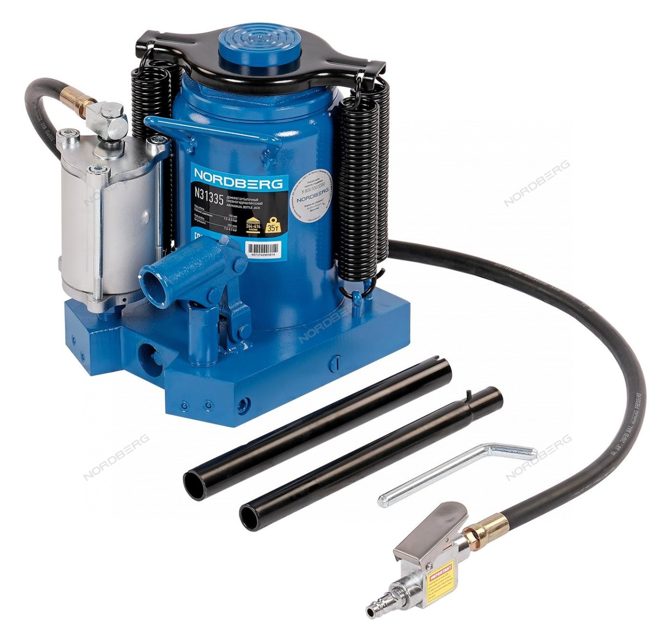 Домкрат бутылочный пневмогидравлические NORDBERG N31335 предназначенный для поднятия грузов при помощи ручного или пневматического привода. Бутылочный домкрат отличается компактностью конструкции, простотой обслуживания и надежностью в эксплуатации. Он позволяет осуществлять плавный подъем груза при небольшом рабочем усилии благодаря высокому передаточному отношению между площадями поперечного сечения цилиндра и плунжера насоса. Широкое опорное основание позволяет использовать домкрат на любой поверхности, включая мягкий грунт.