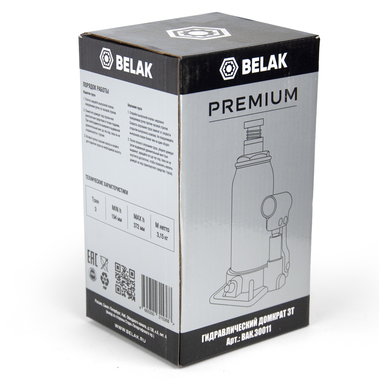 Гидравлический домкрат BELAK PREMIUM 3 т BAK.30011 разработан российским производителем «БелАК», награждённым двумя национальными премиями «Автокомпонент года» и «Автоаксессуар года» за высокое качество и надежность выпускаемых домкратов. Продукция «БелАК» соответствуют нормам сертификации ISO9001 и ЕАС.