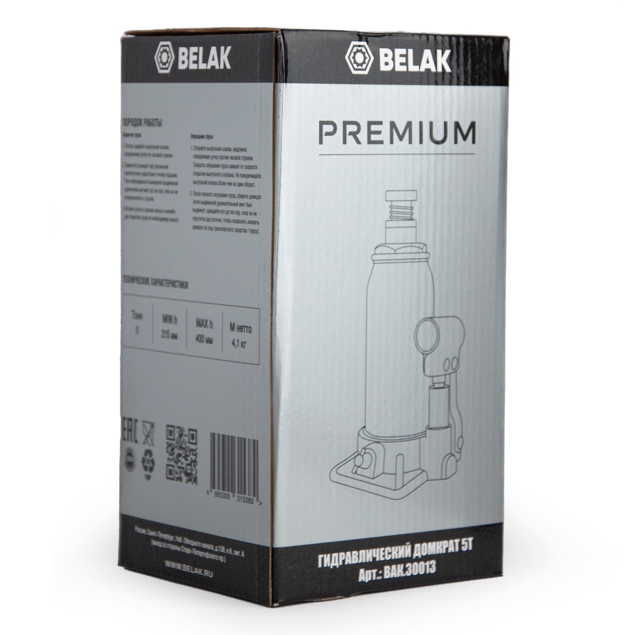 Гидравлический домкрат BELAK PREMIUM 5 т BAK.30013 разработан российским производителем «БелАК», награждённым двумя национальными премиями «Автокомпонент года» и «Автоаксессуар года» за высокое качество и надежность выпускаемых домкратов. Продукция «БелАК» соответствуют нормам сертификации ISO9001 и ЕАС.