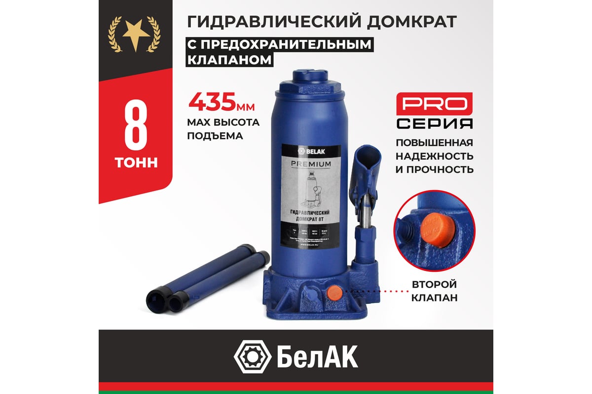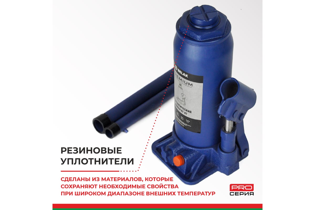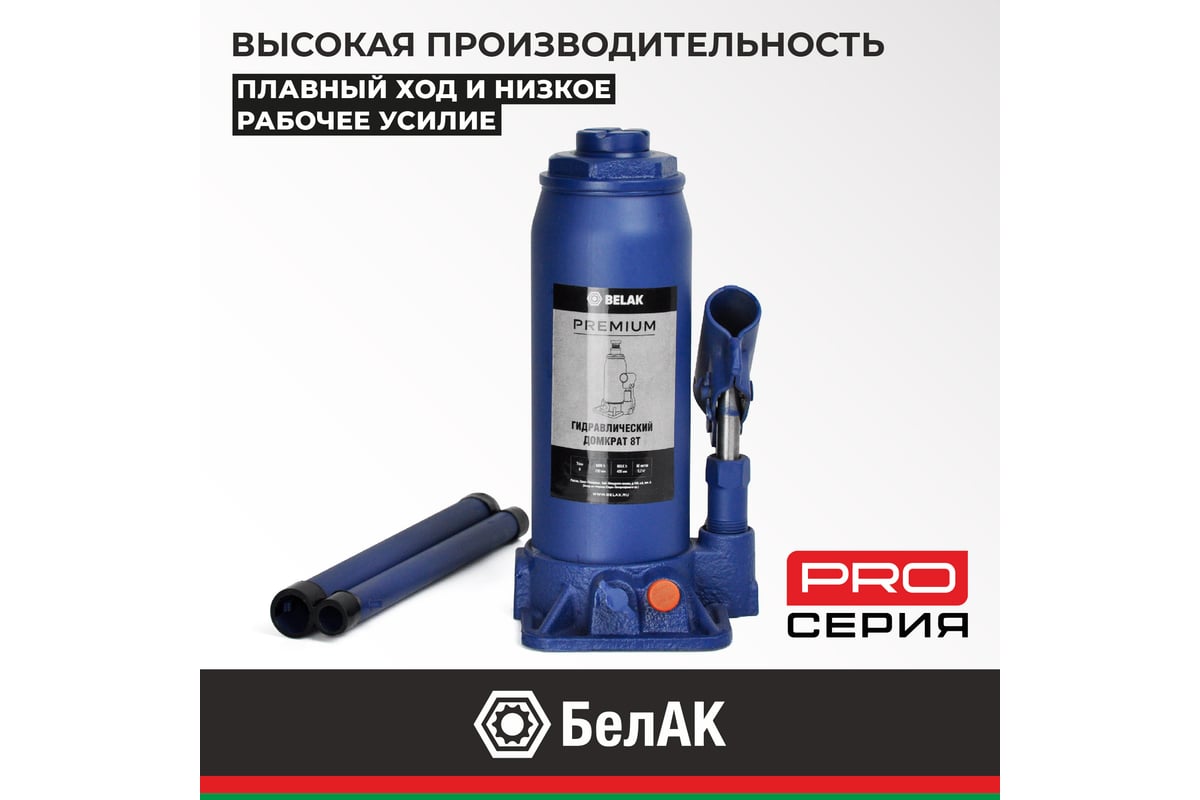 Гидравлический домкрат BELAK PREMIUM 8 т BAK.30015 – это простое в использовании, надежное и долговечное устройство для поднятия транспорта или других грузов. Агрегат отличается компактными габаритами при внушительной грузоподъемности в 8 тонн. Стальной корпус модели имеет качественное покрытие, защищающее его от коррозии. Особый состав гидравлической жидкости позволяет использовать домкрат в широком температурном диапазоне.