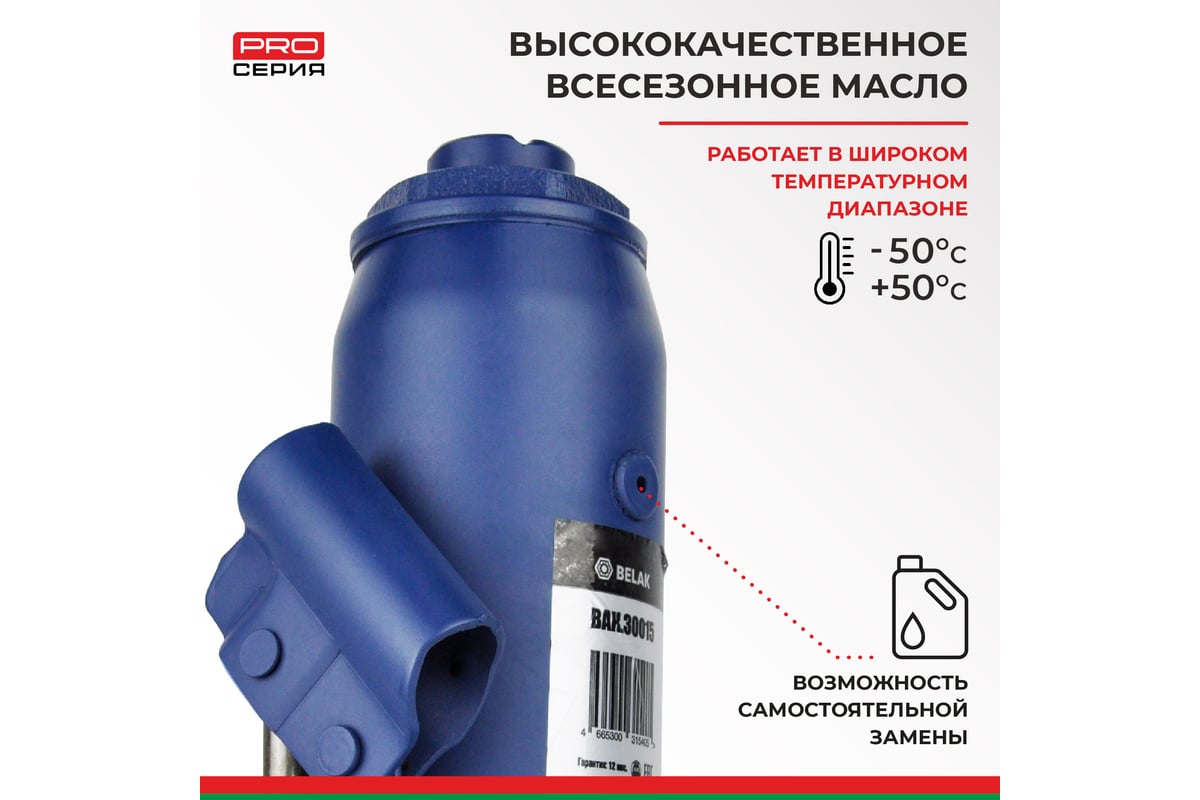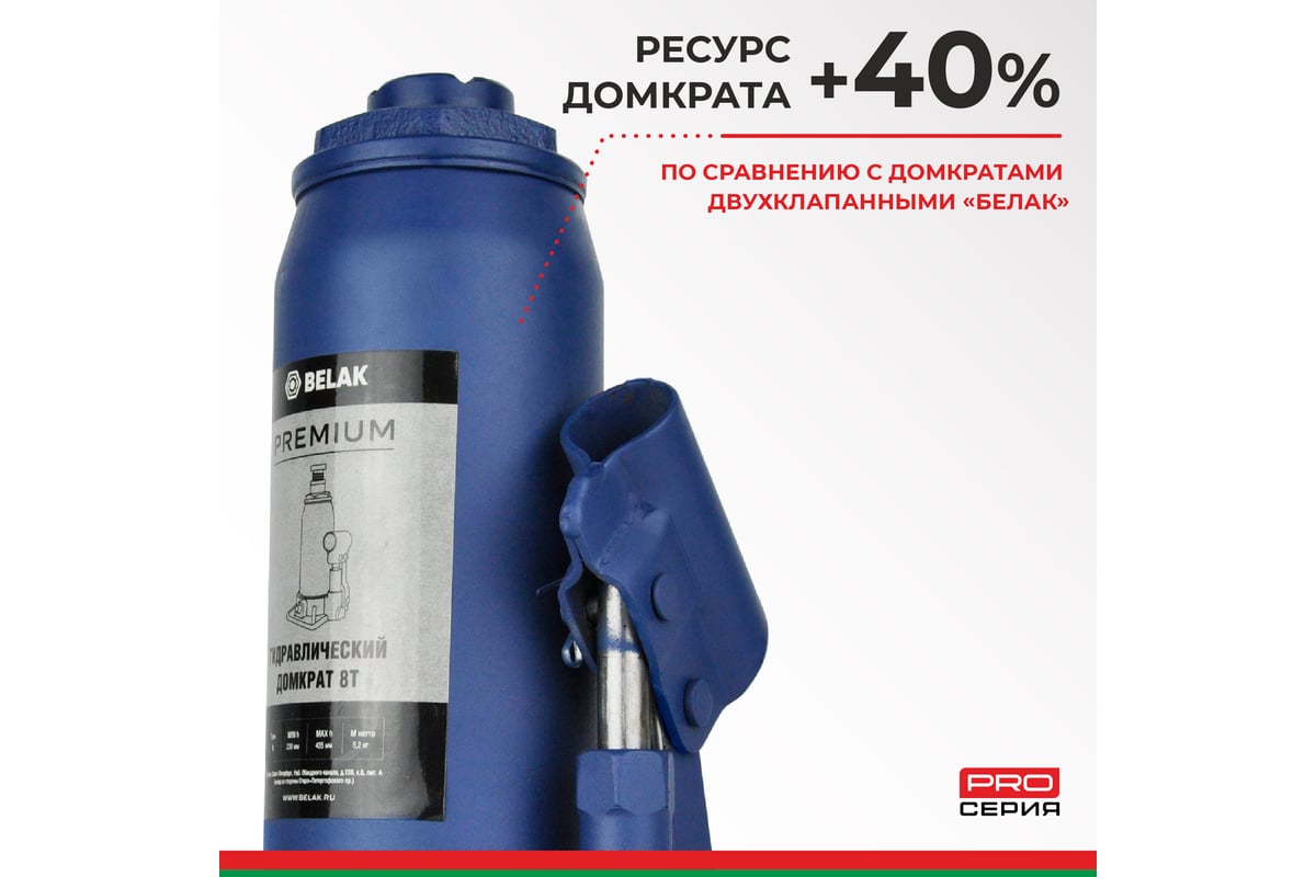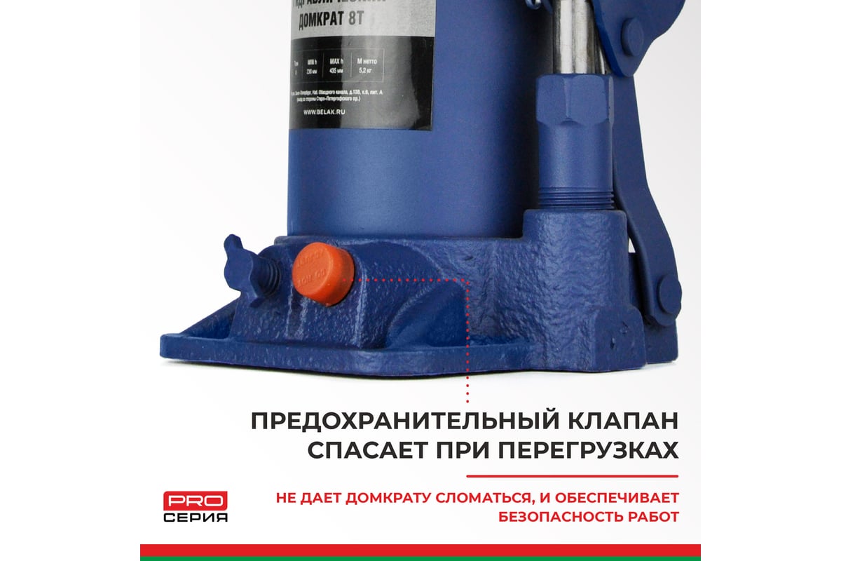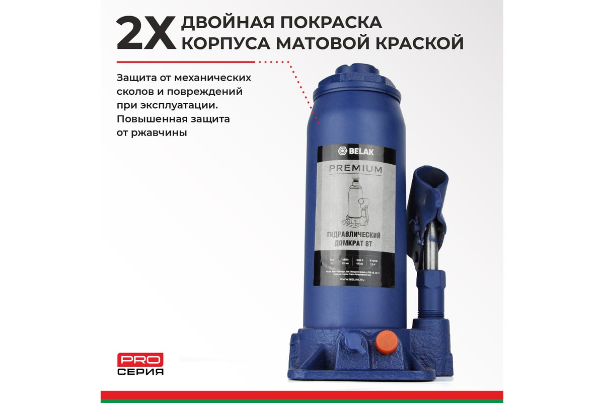 Гидравлический домкрат BELAK PREMIUM 8 т BAK.30015 – это простое в использовании, надежное и долговечное устройство для поднятия транспорта или других грузов. Агрегат отличается компактными габаритами при внушительной грузоподъемности в 8 тонн. Стальной корпус модели имеет качественное покрытие, защищающее его от коррозии. Особый состав гидравлической жидкости позволяет использовать домкрат в широком температурном диапазоне.