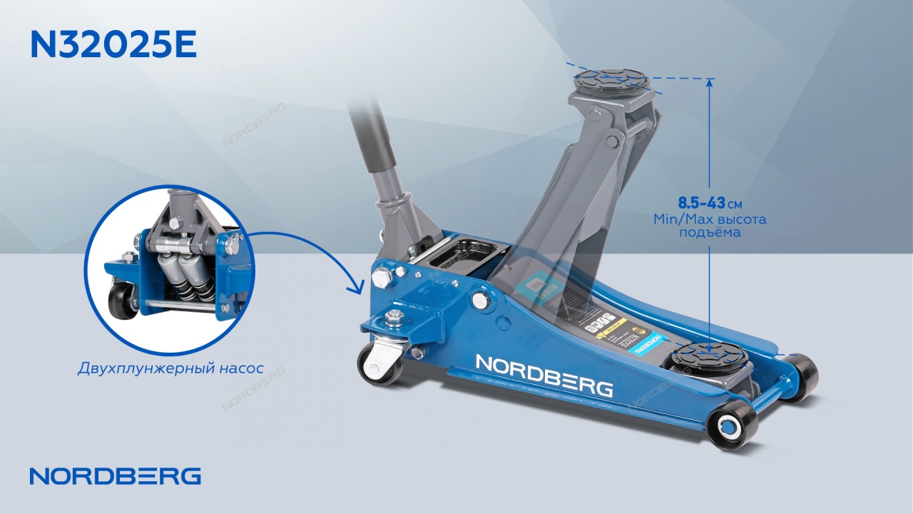 Подкатной домкрат с резиновой насадкой NORDBERG N32025E – надежное, удобное и безопасное оборудование для подъемных работ в процессе ремонта и обслуживания автомобиля. Обеспечивает плавное поднятие и опускание транспортных средств для проведения шиномонтажа, диагностики, обслуживания, ремонта. Необходим при выполнении таких работ как замена колеса, осмотр или ремонт подвески и различных узлов и агрегатов.