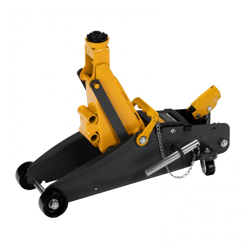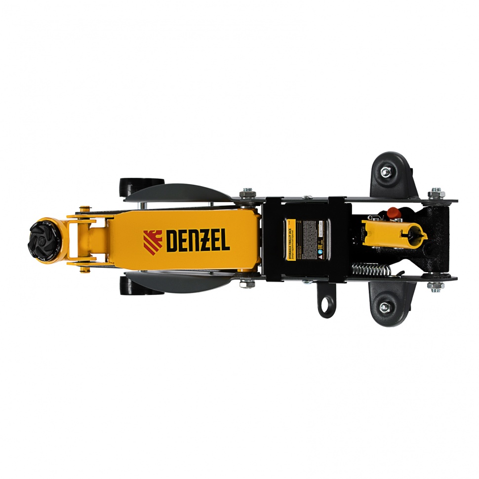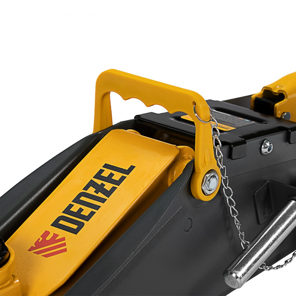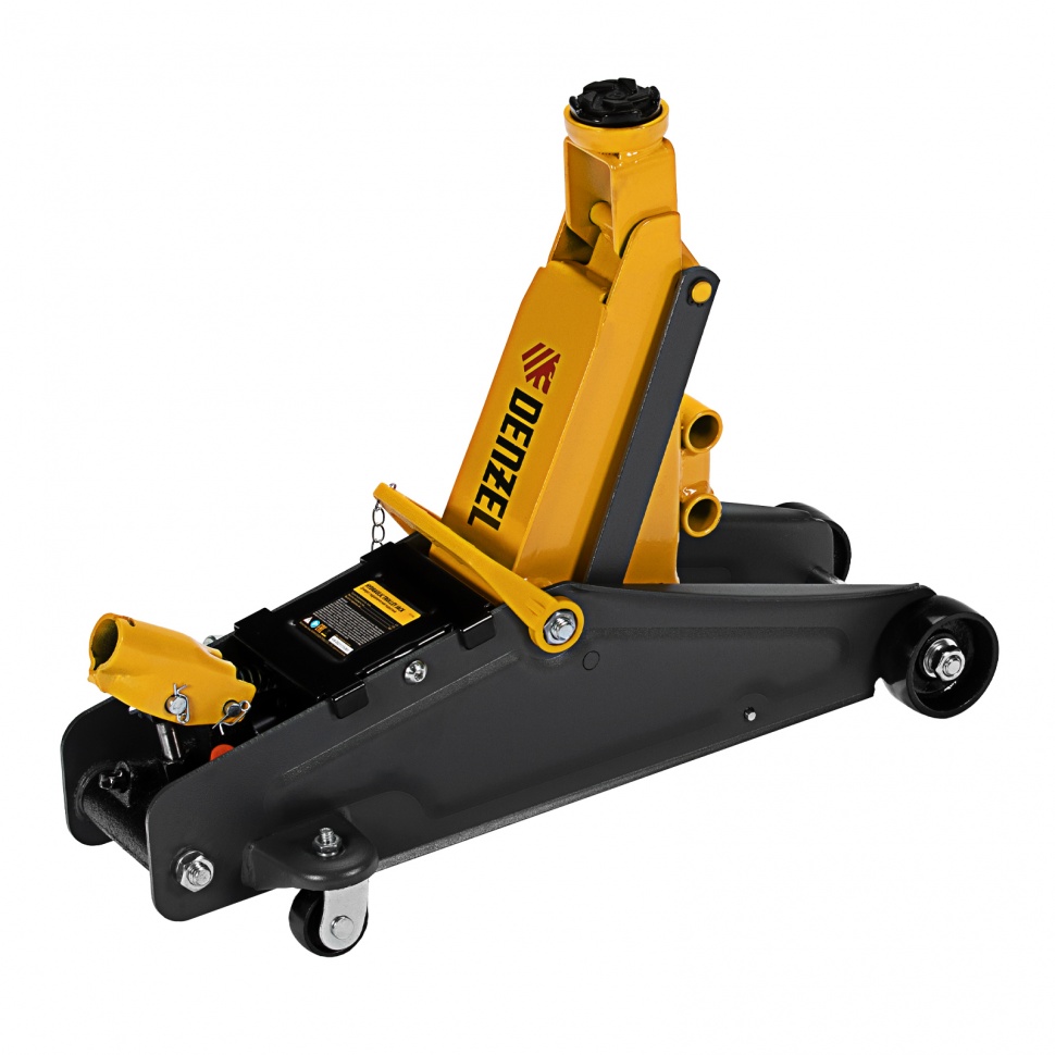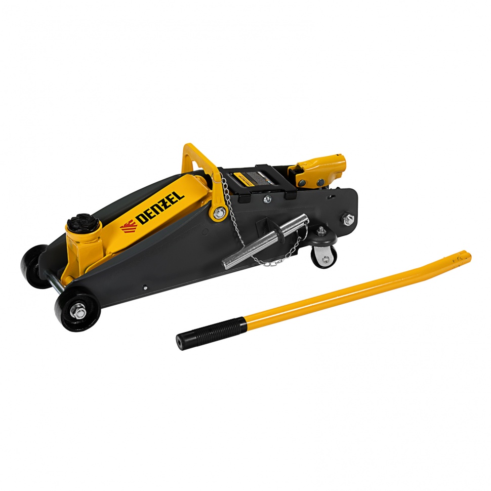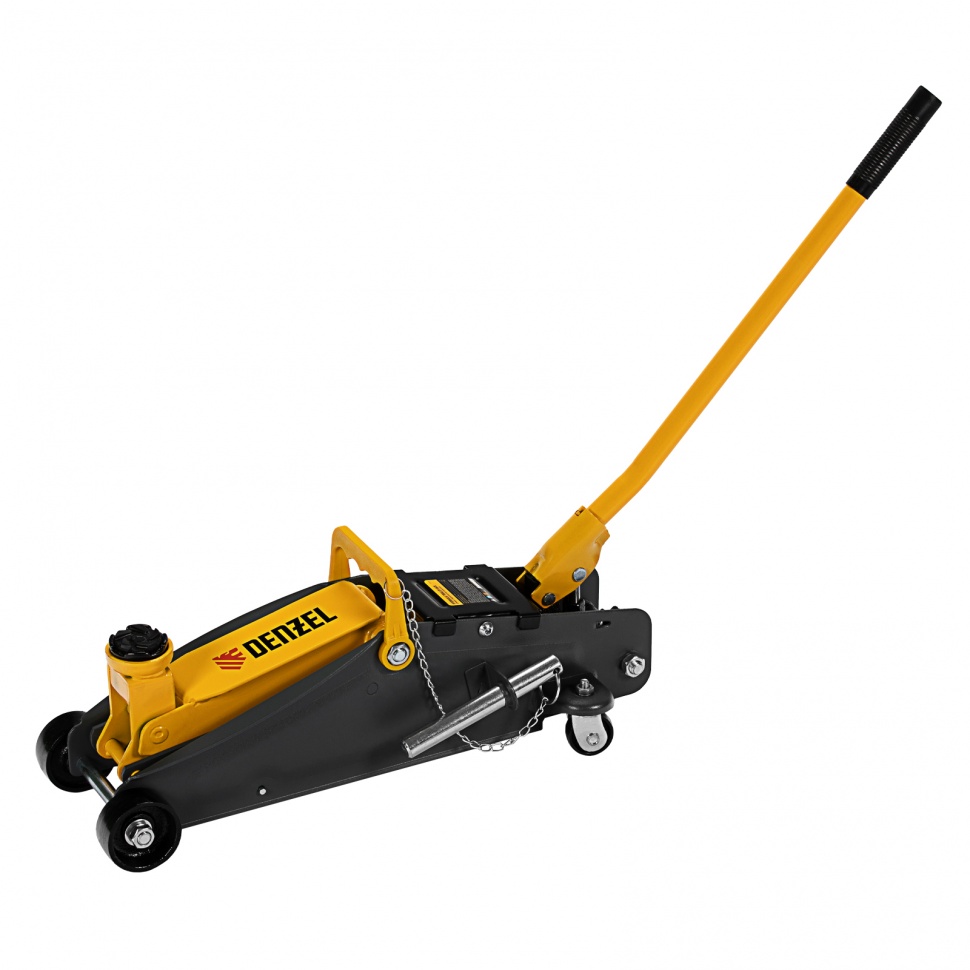 Подкатной гидравлический домкрат Denzel 51155 с фиксатором позволяет поднимать грузы весом до 2,8 т на высоту 385 мм.