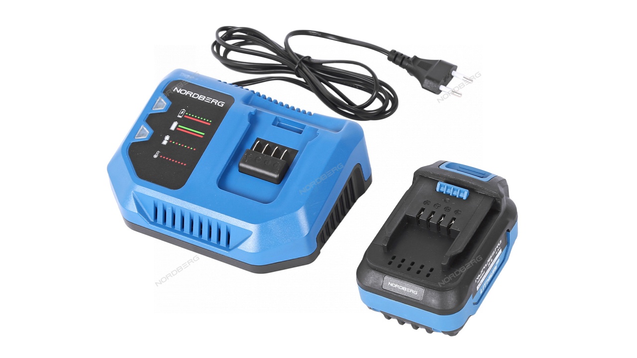 • Литиево-ионный аккумулятор емкостью 4 А·ч и напряжением 20 В, совместимый с аккумуляторным инструментом NORDBERG*