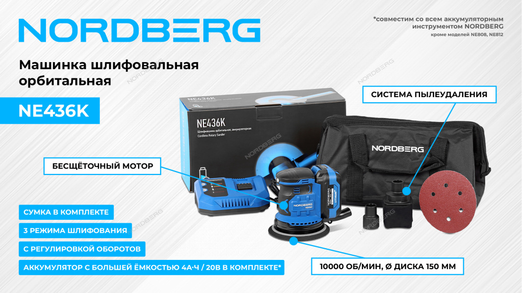 Орбитальная аккумуляторная шлифмашинка NORDBERG NE436K – мощный и производительный инструмент, который может применяться как для профессионального, так и для домашнего использования.