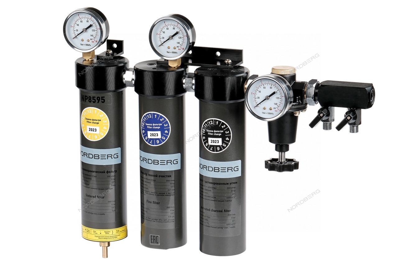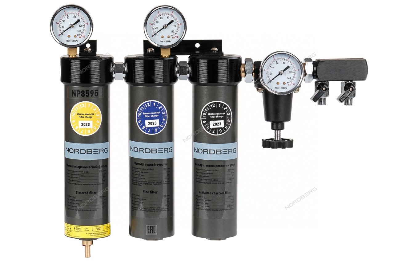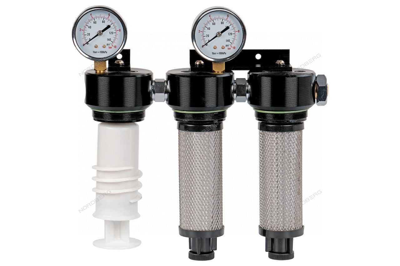 Трехступенчатая фильтр-группа NORDBERG NP8595 подходит для краскопультов с манометрами и регулятором давления предназначена для окрасочных камер и зон подготовки к окраске.