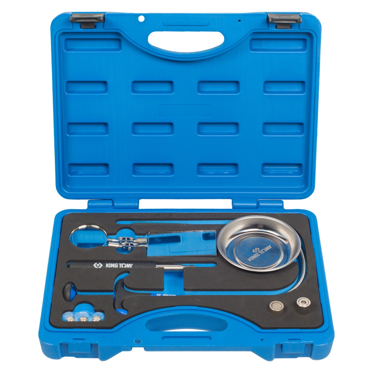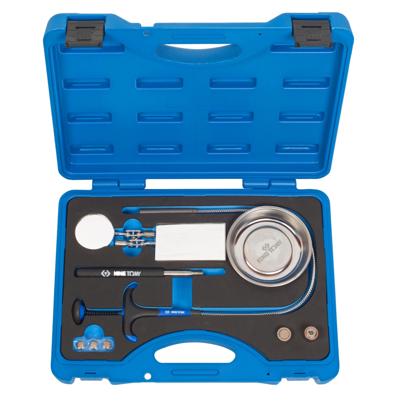 Инспекционный набор KING TONY 9TQ01. Любой ремонт невозможно представить без сопутствующих аксессуаров и приспособлений, которые помогают в работе. Заглянуть в труднодоступное место, подсветить узел агрегата, достать упавшую в недра двигателя небольшую деталь, магнитная тарелка для сбора мелкого крепежа – для всего этого предназначен новый набор марки KING TONY.