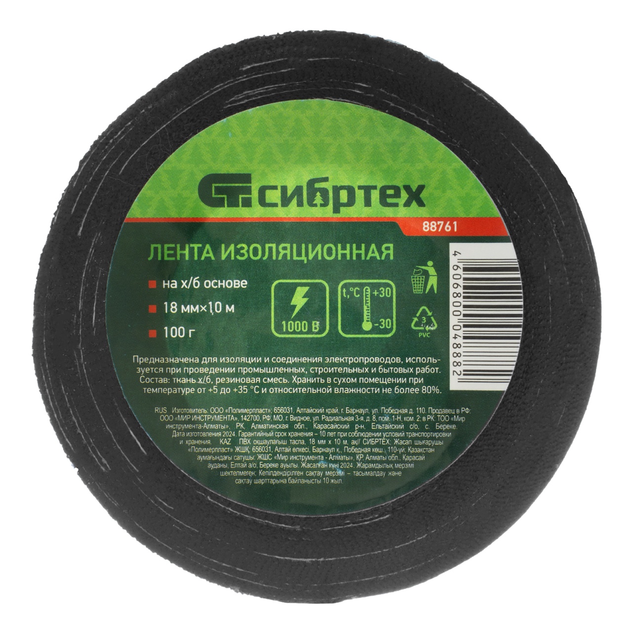Изолента на ХБ-основе Сибртех 88761 размером 18 мм x 10 м и весом 100 г используется для соединения, жгутирования, защиты и изоляции проводов. Выдерживает рабочее напряжение до 1000 В и будет полезна при проведении электромонтажных работ.