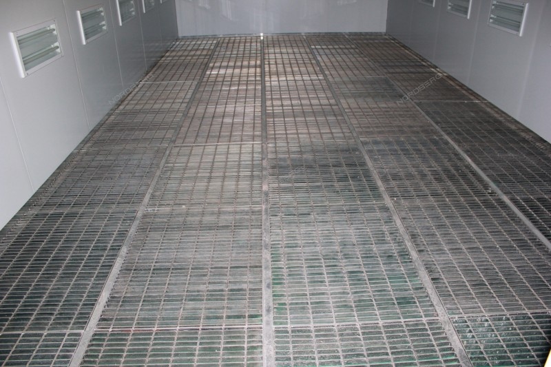 Основание | Конструкция высотой 300 мм из оцинкованного металла, усилена металлическими балками 2 ряда напольных решеток, 3 ряда металлических пластин. Без трапов |