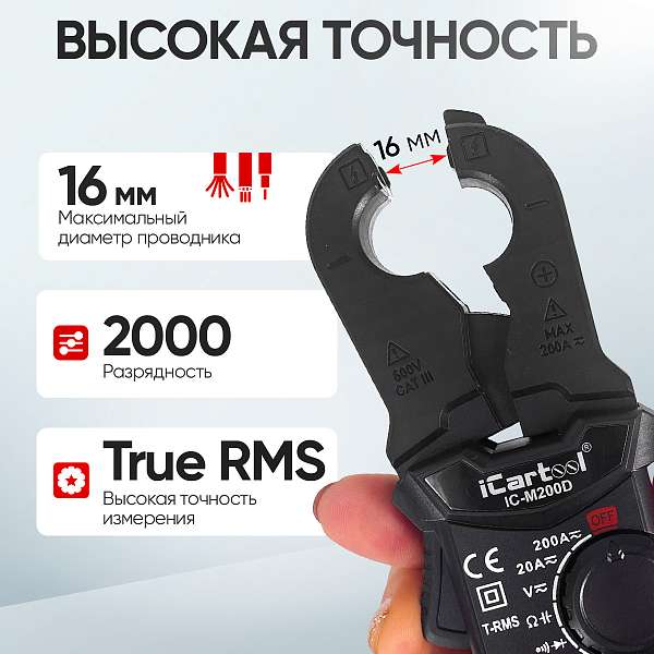 Токовые клещи iCartool IC-M200D позволяют измерять постоянный и переменный ток до 200А. Имеют рейтинг электробезопасности CAT III 600V, высокую точность и стабильность измерений. Также эти клещи представляют продвинутый мультиметр с широким набором функций: прозвонка, проверка диодов, измерение частоты и емкости.