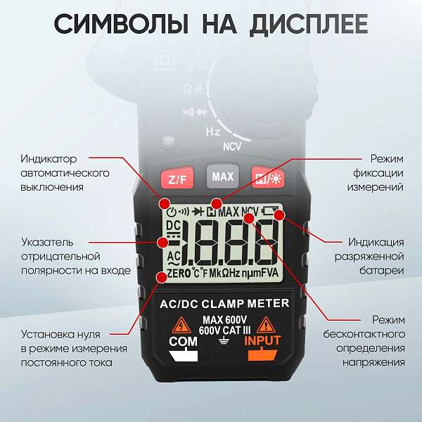 Хорошо читаемый ЖК-дисплей с разрядностью 2000 и индикацией полярности отражает измеряемый параметр и его значение. Наличие цветовой сигнальной подсветки и режим NCV расширяет возможности использования прибора. Узкие зажимы обеспечивают лучшее захватывание тонких проводников, что способствует более точным измерениям тока, особенно в условиях, когда проводник находится вблизи других объектов. Показания этих клещей будут максимально точными благодаря измерению истинных среднеквадратичных значений (True RMS).