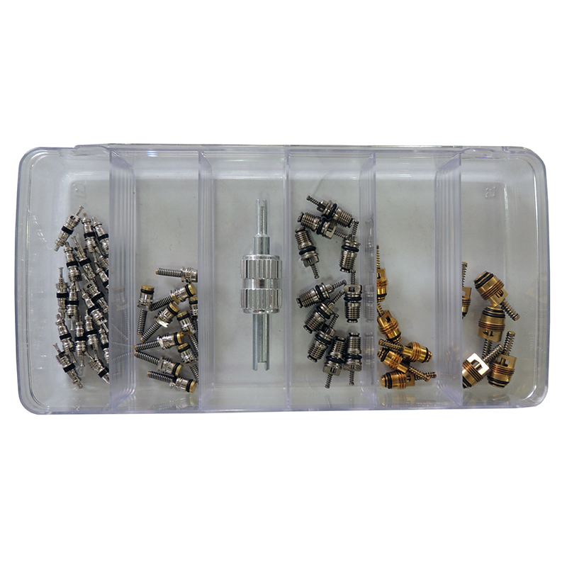 Комплект ниппелей для сервисных портов автомобильных кондиционеров. В комплекте содержится сервисный ключ и набор распространенных ниппелей. Для удобства поставляется в пластмассовом футляре.