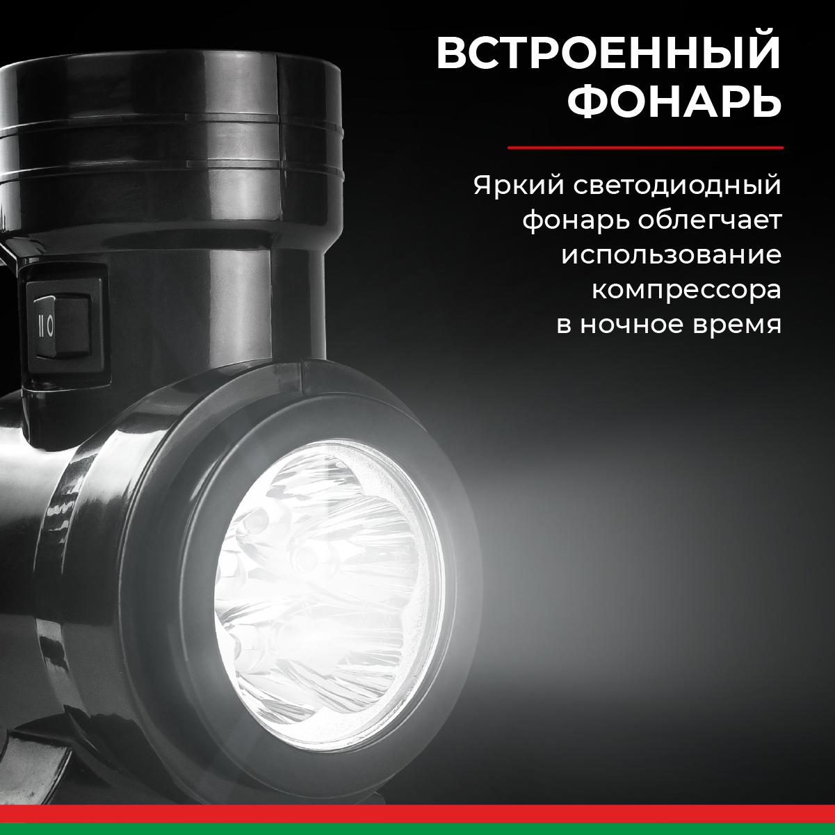 • Встроенный фонарь позволяет использовать компрессор даже в условиях слабого освещения.