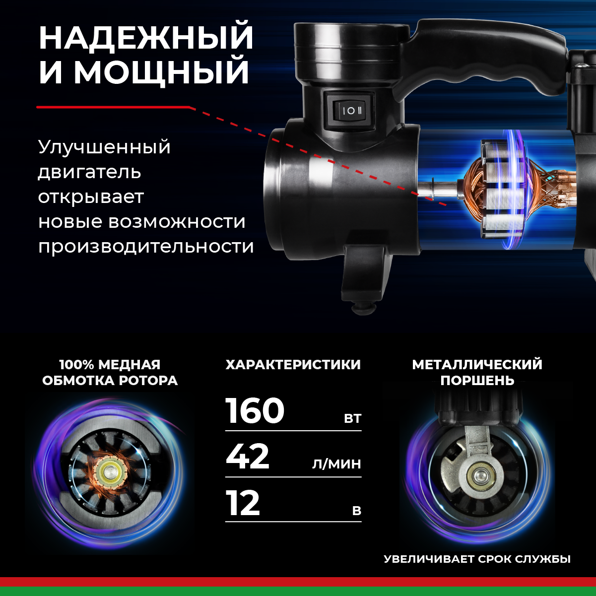 Модель оснащена точным аналоговым манометром, который гарантирует контроль давления. Надежная фиксация на скользкой поверхности обеспечивается за счет резиновых ножек, которые препятствуют скольжению, а крепкий наконечник позволяет подсоединить компрессор к шинам без лишних усилий.