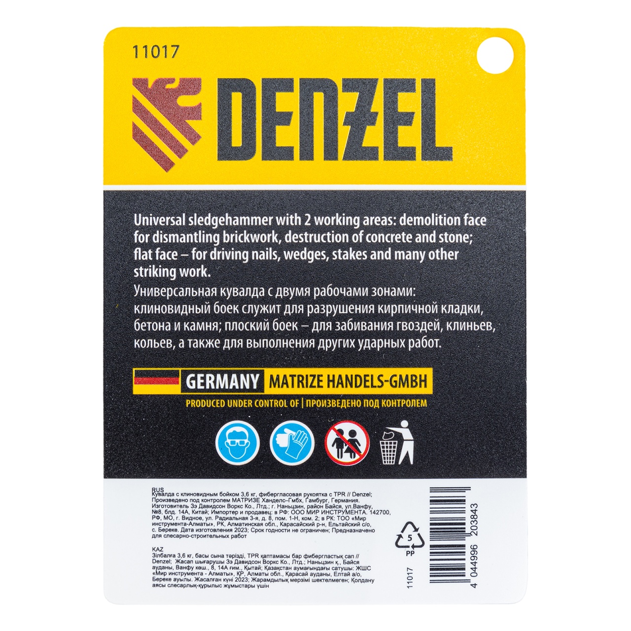 Кувалда Denzel 11017 с клиновидным бойком весом 3,6 кг и фибергласовой рукояткой с TPR-покрытием предназначена для нанесения ударов. Две рабочие зоны делают ее универсальной в работе: клиновидный боек позволяет разрушать кирпичную кладку, конструкции из бетона и камня, а плоский боек — забивать большие гвозди, колья, клинья и выполнять другие ударные работы. Инструмент также подходит для сгибания и придания формы металлическим деталям. Используется при проведении слесарных, строительных и кузовных работ, подойдет и для бытового применения.