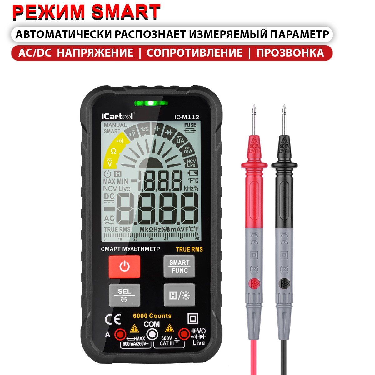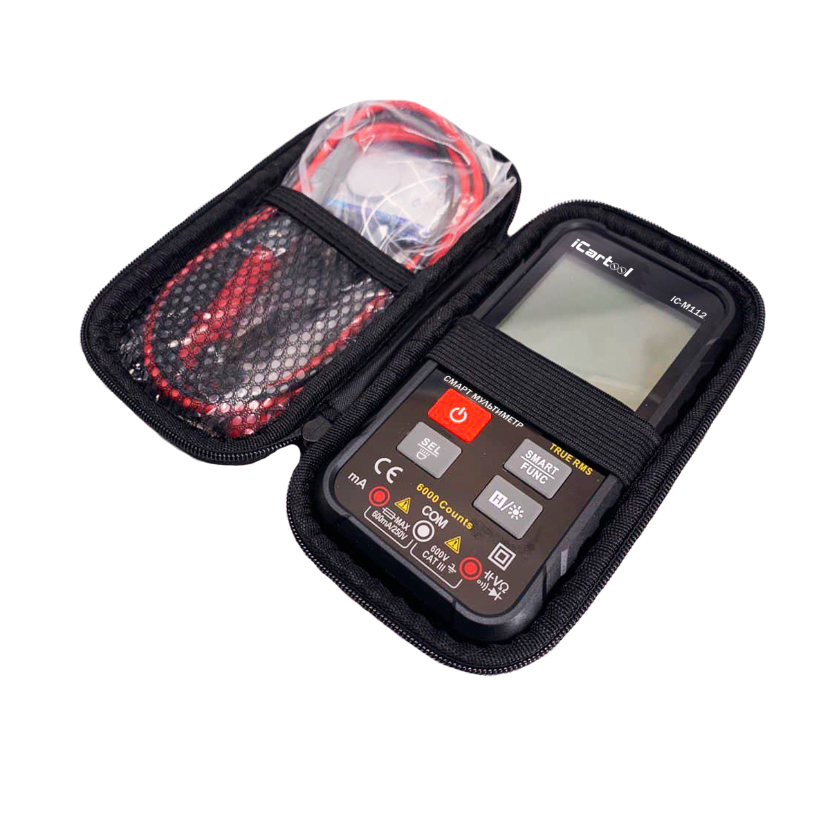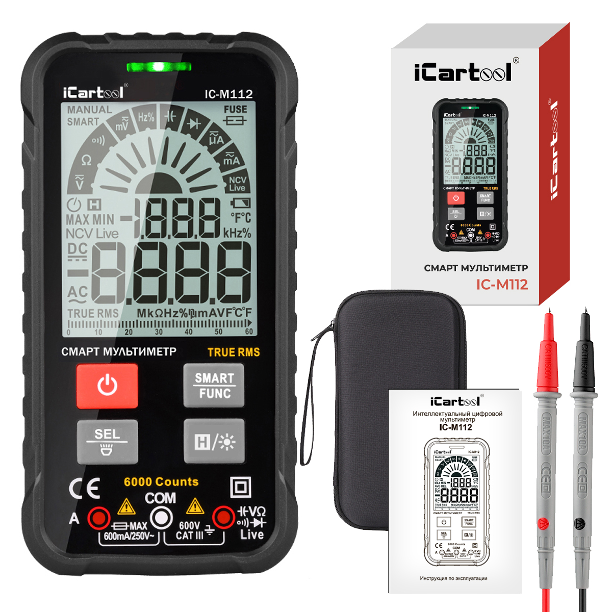iCartool IC-M112 - интеллектуальный цифровой мультиметр с категорией электробезопасности CAT III 600V для решения задач по проверке, тестированию и диагностике электрооборудования. Мультиметр может использоваться как для бытового, так и для профессионального использования. Его основной особенностью является автоматический (интеллектуальный) режим, в котором он сам распознает измеряемый параметр: постоянное/переменное напряжение, сопротивление или контроль целостности цепи. Для выбора других режимов используется всего одна кнопка. Полученные значения выводятся на большой ЖК дисплей 6000 отсчетов с подсветкой.