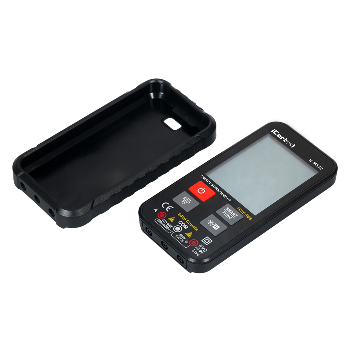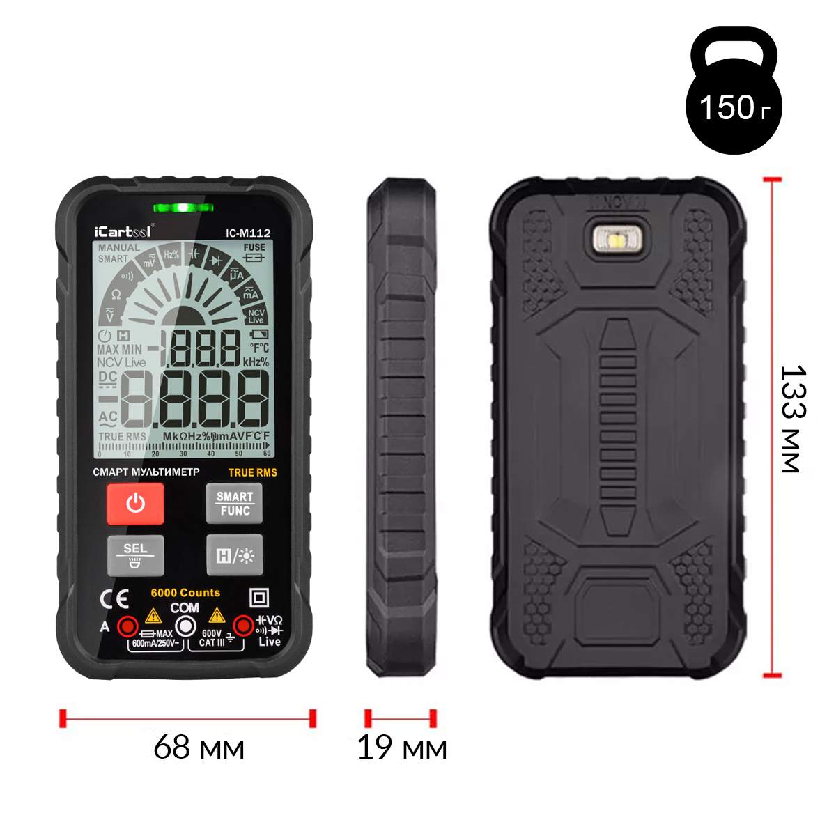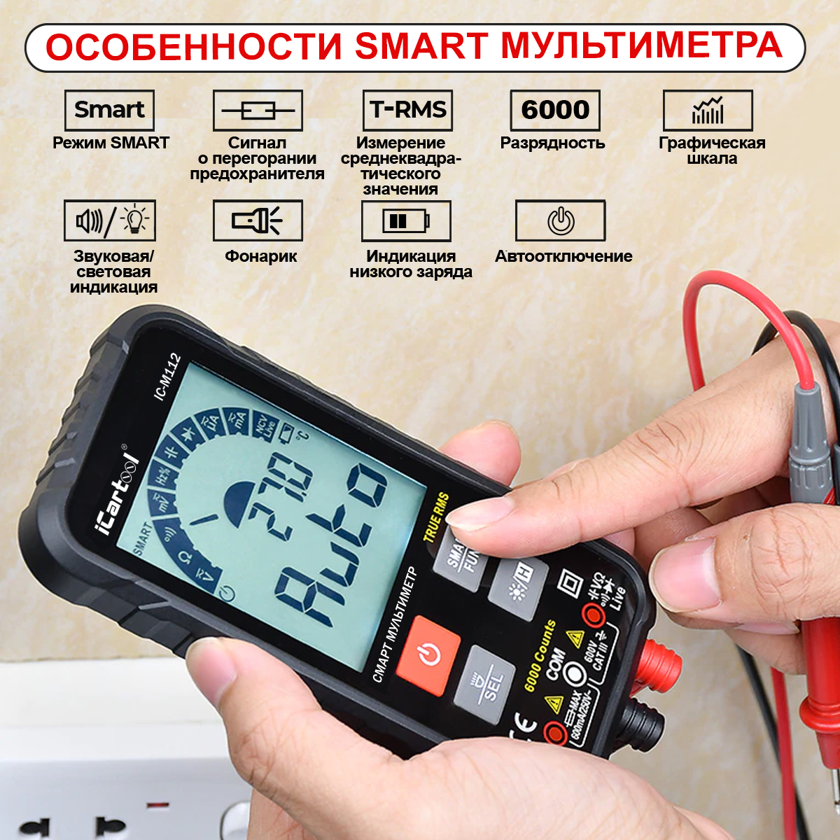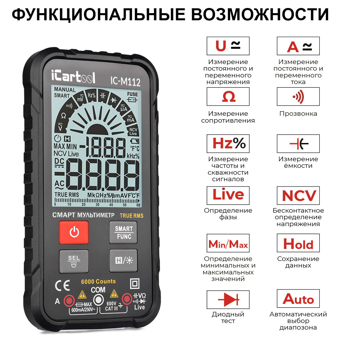 iCartool IC-M112 - интеллектуальный цифровой мультиметр с категорией электробезопасности CAT III 600V для решения задач по проверке, тестированию и диагностике электрооборудования. Мультиметр может использоваться как для бытового, так и для профессионального использования. Его основной особенностью является автоматический (интеллектуальный) режим, в котором он сам распознает измеряемый параметр: постоянное/переменное напряжение, сопротивление или контроль целостности цепи. Для выбора других режимов используется всего одна кнопка. Полученные значения выводятся на большой ЖК дисплей 6000 отсчетов с подсветкой.