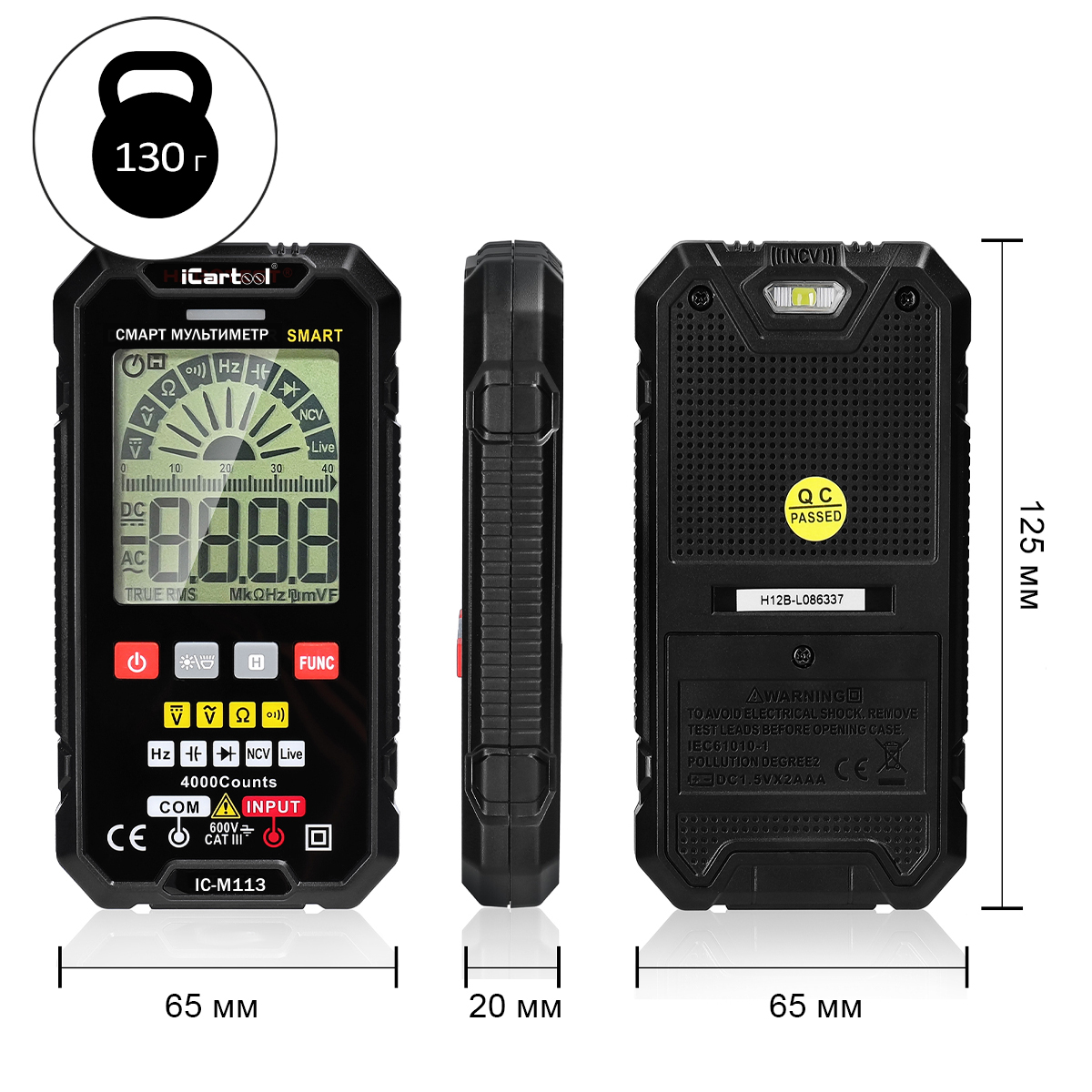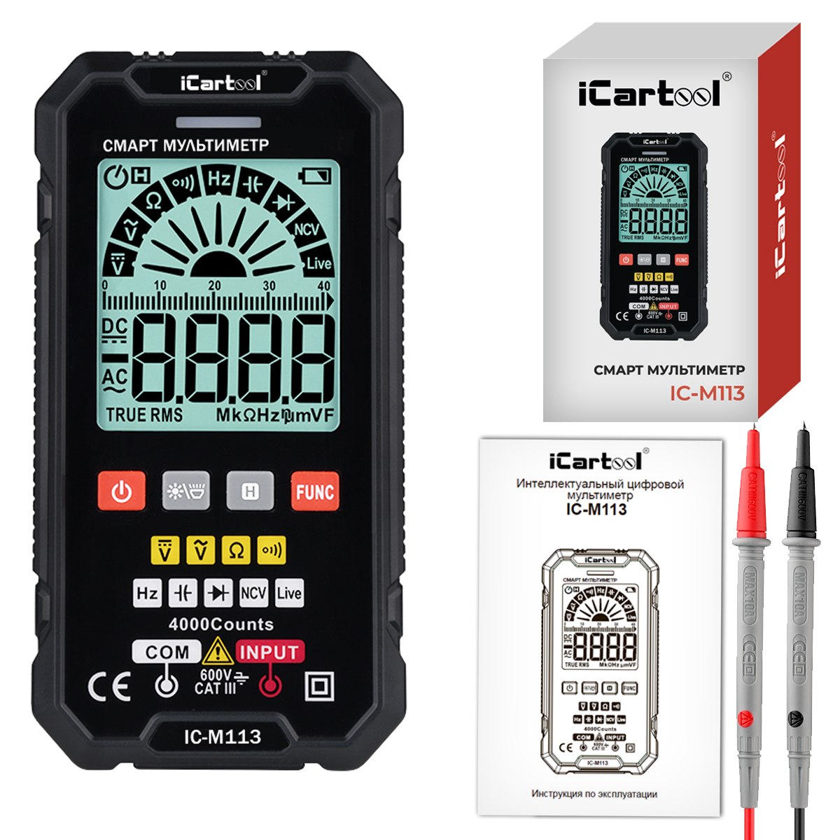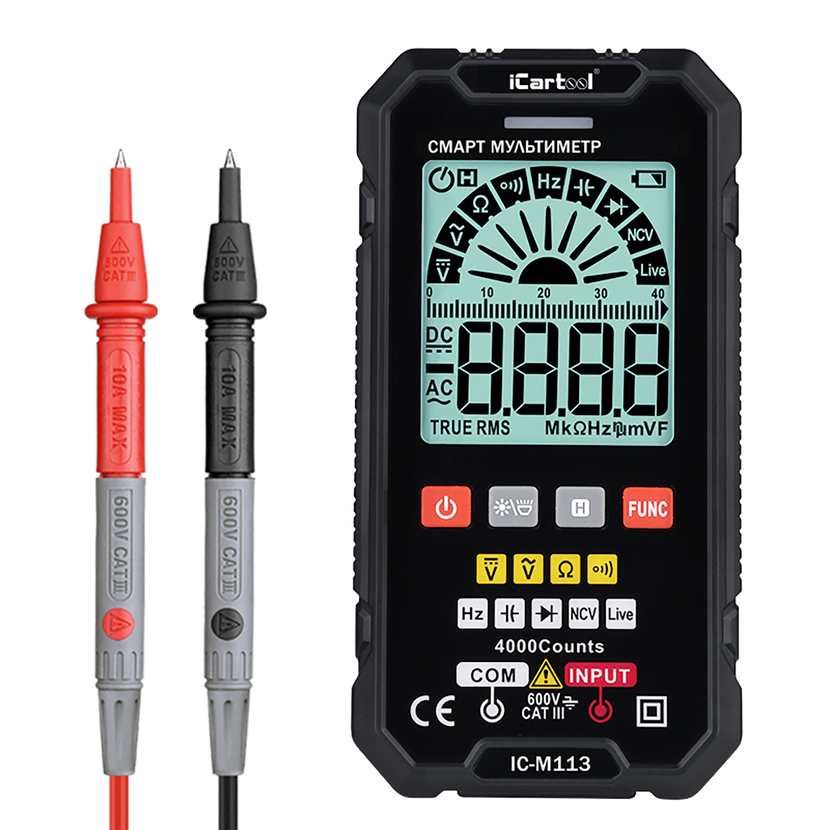 Цифровой смарт-мультиметр IC-M113 с технологией измерения значений True RMS, большим ЖК-дисплеем и классическим набором функций. Отличается малым весом и оригинальным современным дизайном. Подсветка экрана и яркий фонарик, встроенный в мультиметр помогут произвести замеры в условиях недостаточной освещенности. Незаменим для домашних ремонтных работ по электрике, в гараже для обслуживания электроцепей автомобиля и для радиолюбителей.