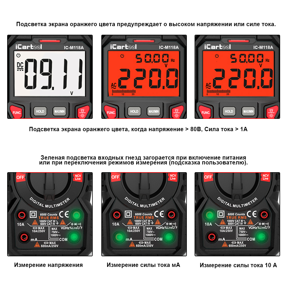 • В зависимости от выбранного режима измерения, гнезда щупов подсвечиваются с целью правильного подключения к ним
