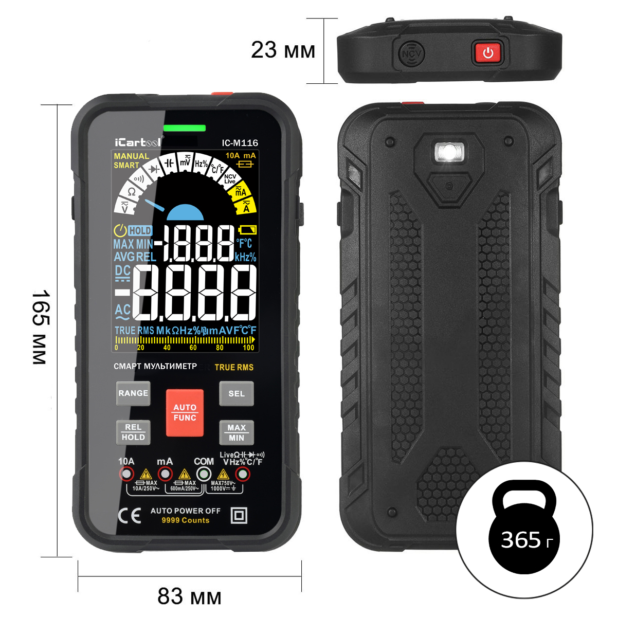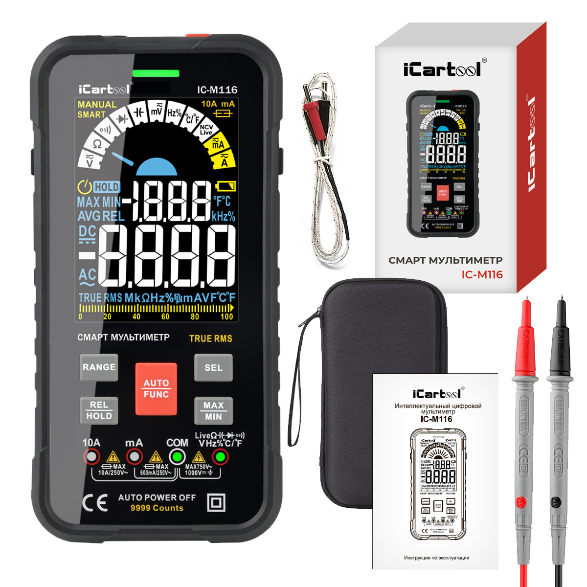 Интеллектуальный цифровой мультиметр IC-M116 с автоматическим выбором режима измерения, большим цветным дисплеем и широким набором дополнительных функций. Незаменим для решения задач по проверке, тестированию и диагностике электрооборудования. Имеет высокий рейтинг электробезопасности CAT III 1000V, CAT IV 600V и диапазон измерения силы тока до 10А. В комплект входят высококачественные мягкие и гибкие щупы, термопара и оригинальный защитный чехол.