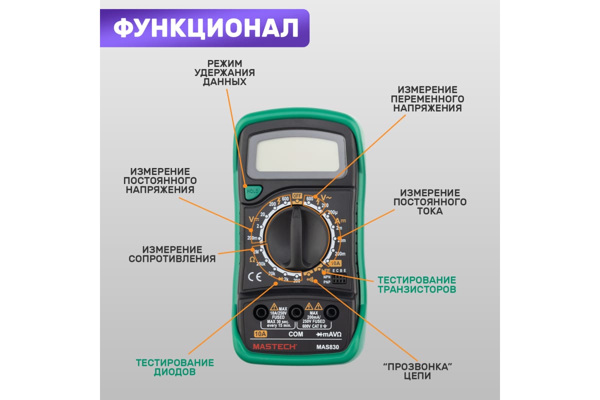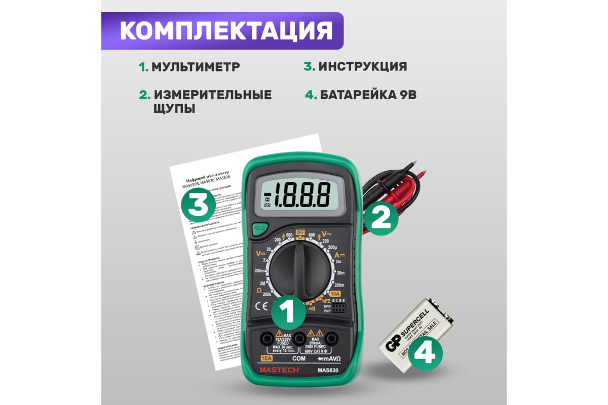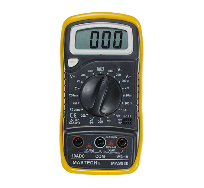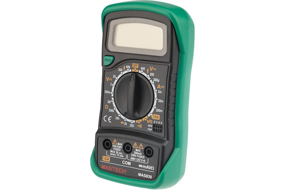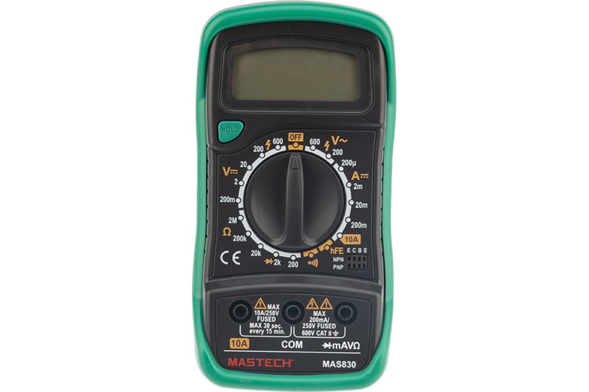 Цифровой мультиметр Mastech MAS830 производит измерения силы постоянного тока, величины постоянного и переменного напряжения, сопротивления и коэффициент усиления биполярных транзисторов (h21). Так же с помощью мультиметра MAS830 можно проверить исправность полупроводниковые диоды и прозвонить надежность соединений в электрической схеме. Результаты измерений выводятся на цифровой 31/2 -разрядный ЖК-дисплей. Результат измерений можно зафиксировать с помощью функции "HOLD". Мягкий полимерный защитный кожух, входящий в комплект поставки, снизит вероятность повреждения мультиметра при падении или неаккуратном использовании. Питание мультиметра осуществляется от одной батареи 9В типа "Крона". В комплекте поставки мультиметра Mastech MAS830 входит полимерный защитный кожух комплект щупов и инструкция на русском языке.