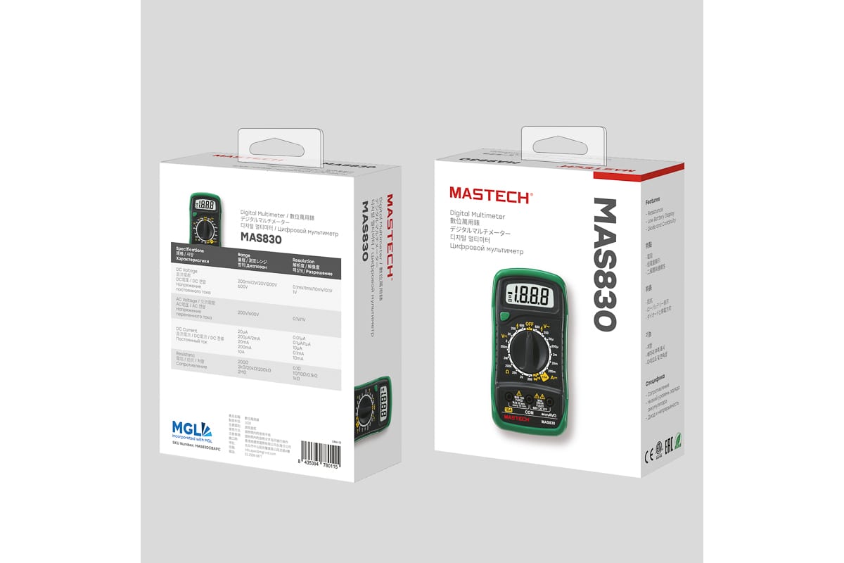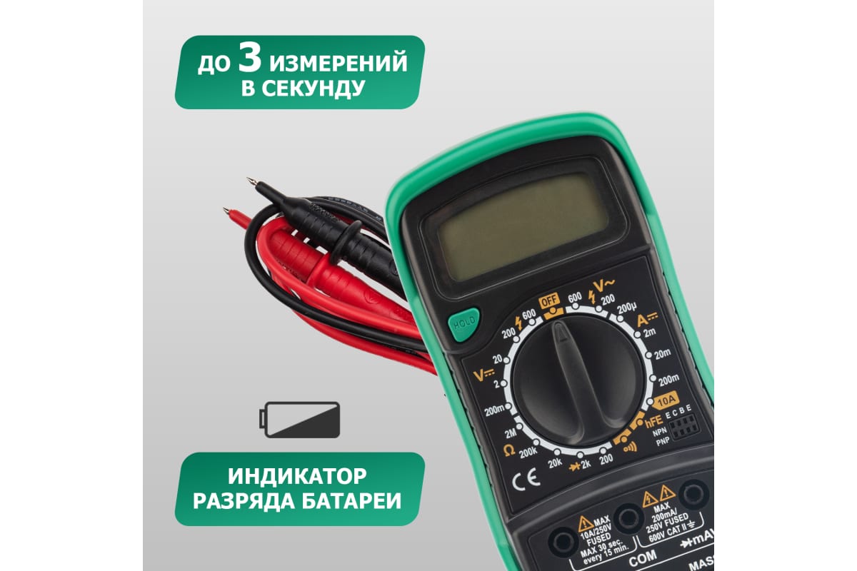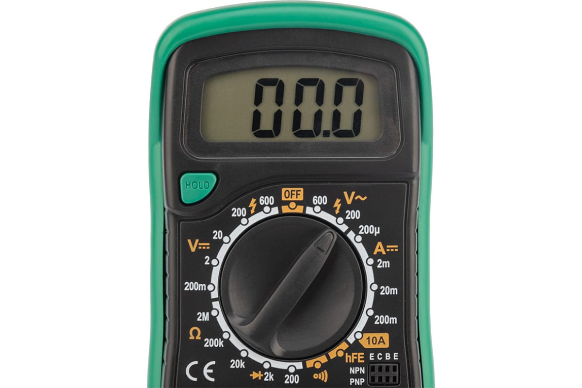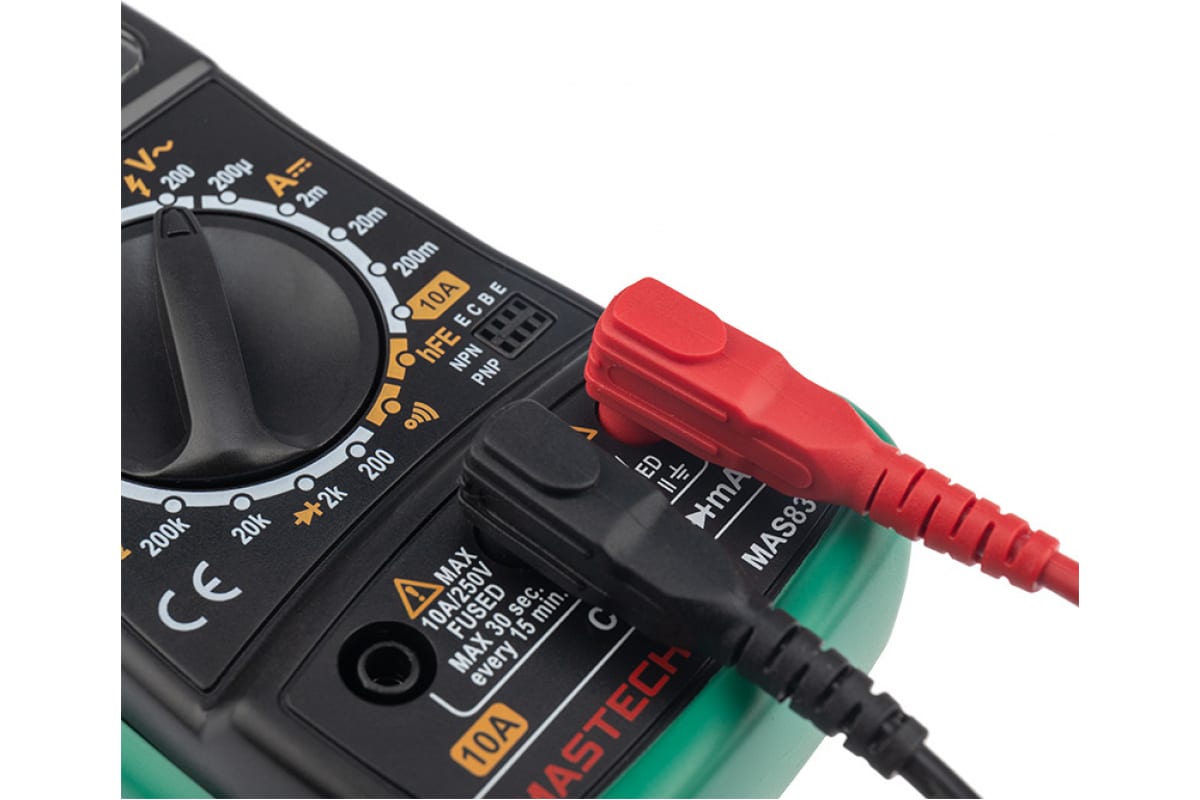 Цифровой мультиметр Mastech MAS830 производит измерения силы постоянного тока, величины постоянного и переменного напряжения, сопротивления и коэффициент усиления биполярных транзисторов (h21). Так же с помощью мультиметра MAS830 можно проверить исправность полупроводниковые диоды и прозвонить надежность соединений в электрической схеме. Результаты измерений выводятся на цифровой 31/2 -разрядный ЖК-дисплей. Результат измерений можно зафиксировать с помощью функции "HOLD". Мягкий полимерный защитный кожух, входящий в комплект поставки, снизит вероятность повреждения мультиметра при падении или неаккуратном использовании. Питание мультиметра осуществляется от одной батареи 9В типа "Крона". В комплекте поставки мультиметра Mastech MAS830 входит полимерный защитный кожух комплект щупов и инструкция на русском языке.