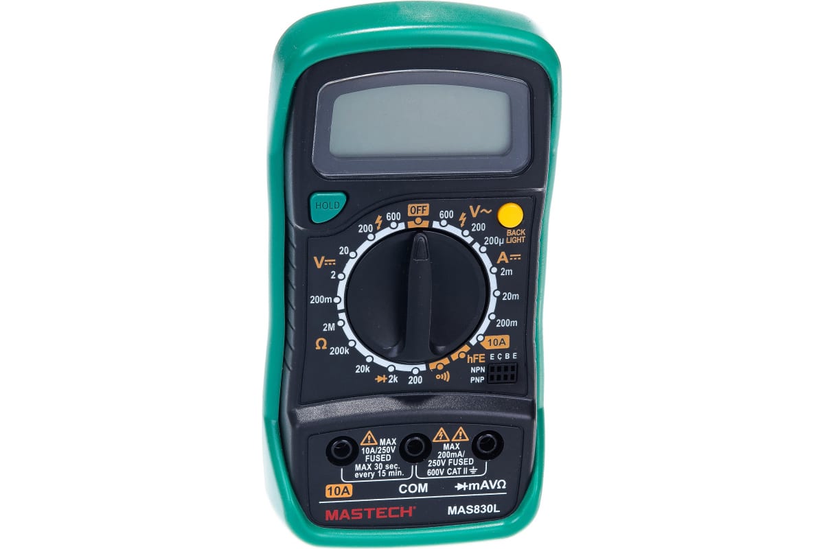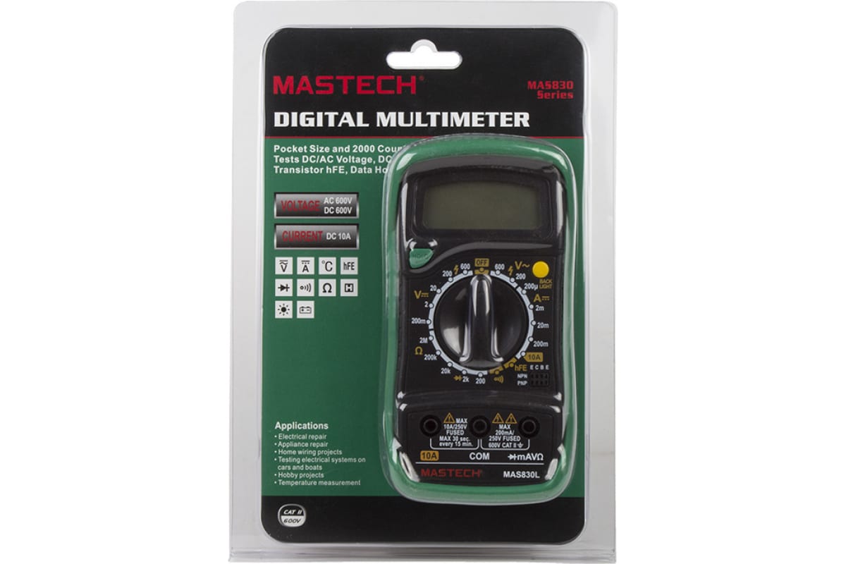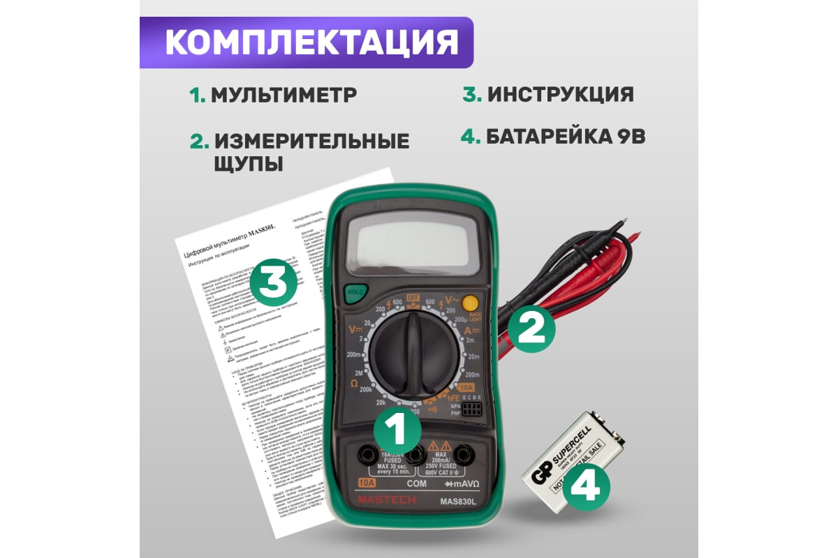 • В комплекте поставки мультиметра Mastech MAS838 входит полимерный защитный кожух комплект щупов, термопара для измерения температуры и инструкция на русском языке.