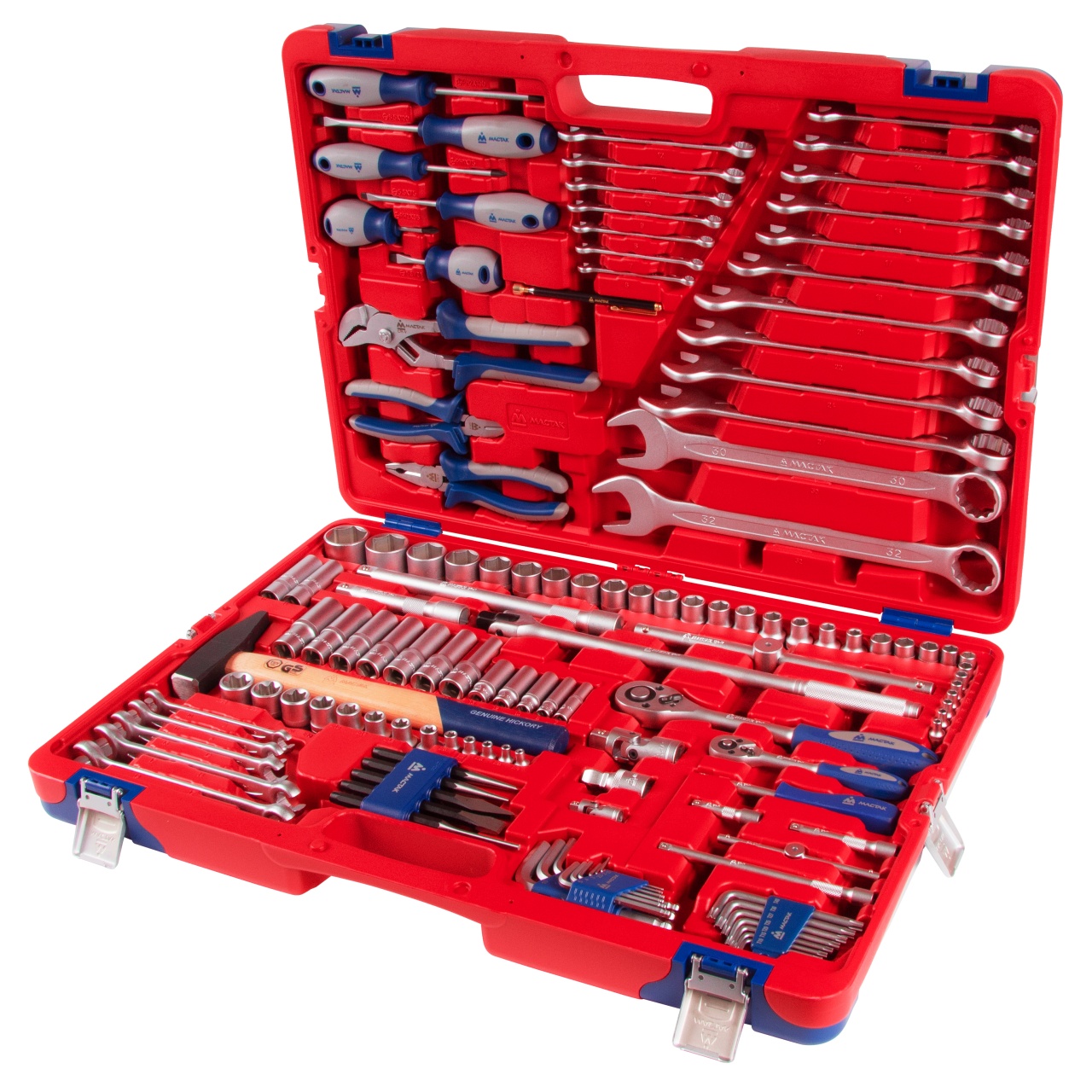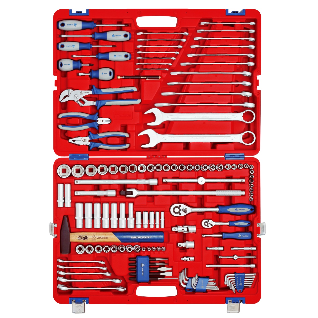 Материалы – инструментальные стали Cr-V, Cr-Mo, SNCM+V (S2), хром, пластики PP, PP+TPR (рукояти), конструкционная сталь, дерево (рукоять молотка)
