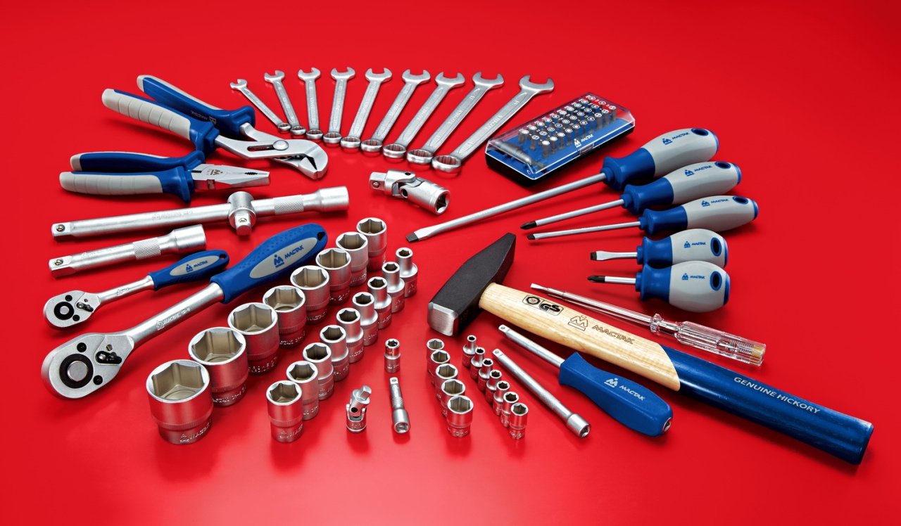 Материалы – инструментальные стали Cr-V, Cr-Mo, SNCM+V (S2), хром, пластики PP, PP+TPR (рукояти), конструкционная сталь, дерево (рукоять молотка)
