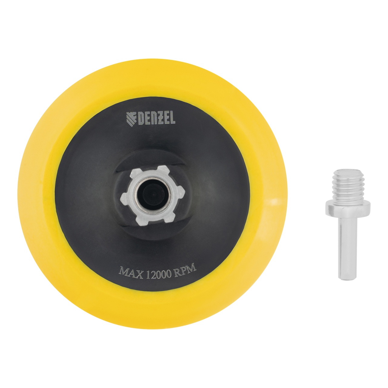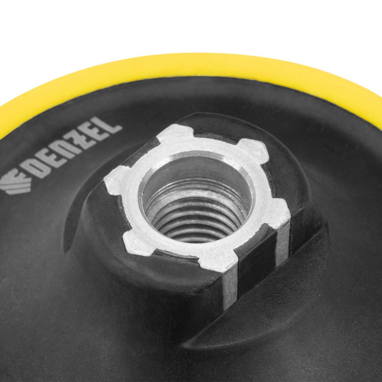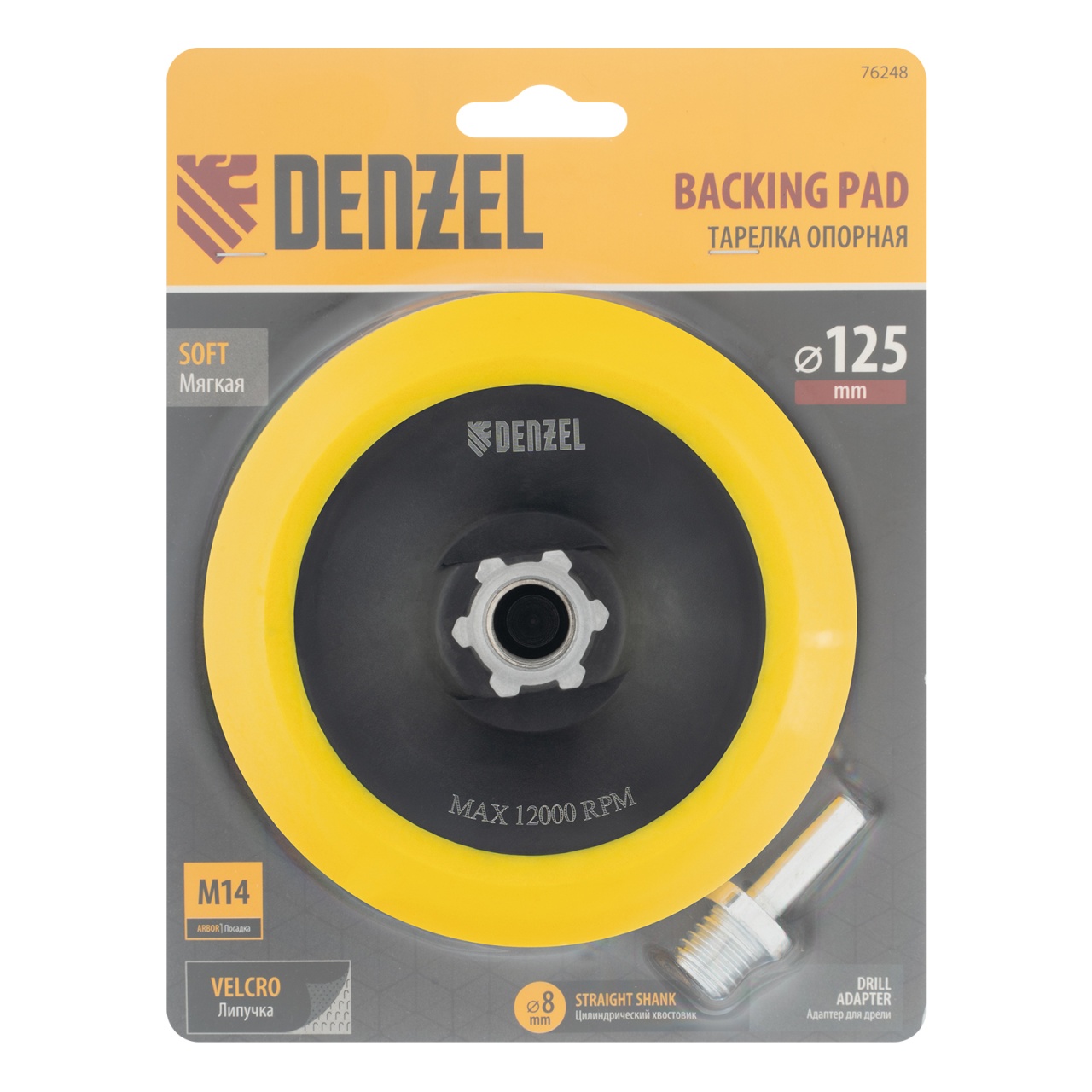 Тарелка опорная Denzel 76248 диаметром 125 мм, с липучкой и адаптером с М14 на d8, мягкая, устанавливается на дрель или углошлифовальную машину (УШМ). Используется для крепления абразивных или полировальных кругов на ворсовой основе, позволяет подготовить поверхность для дальнейшей обработки или придать ей финишную гладкость.