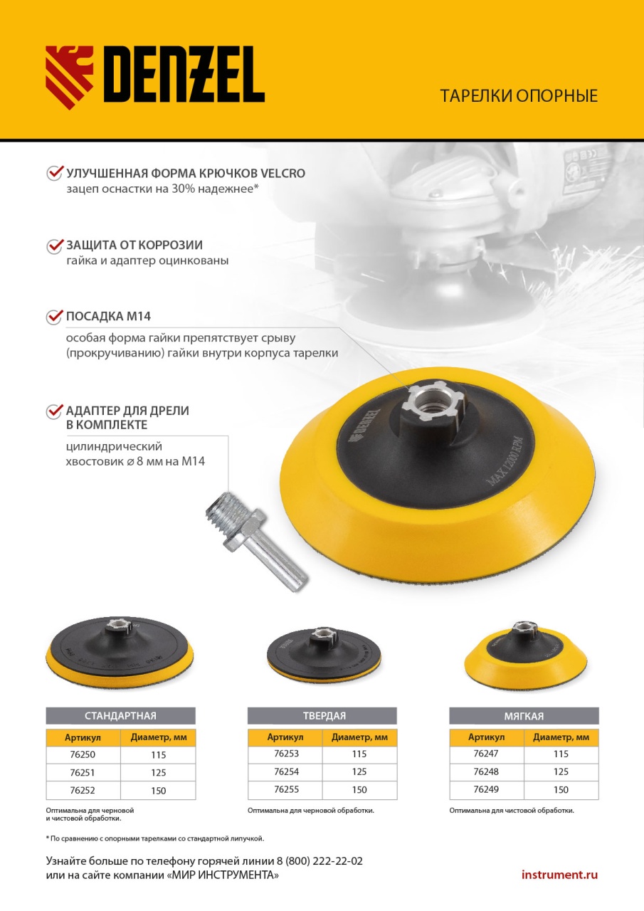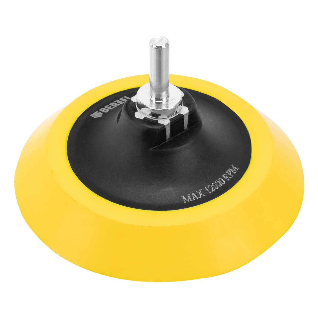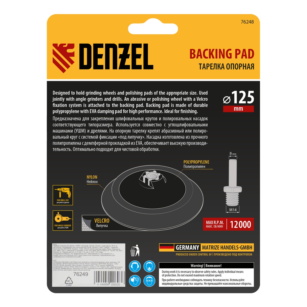 Тарелка опорная Denzel 76248 диаметром 125 мм, с липучкой и адаптером с М14 на d8, мягкая, устанавливается на дрель или углошлифовальную машину (УШМ). Используется для крепления абразивных или полировальных кругов на ворсовой основе, позволяет подготовить поверхность для дальнейшей обработки или придать ей финишную гладкость.