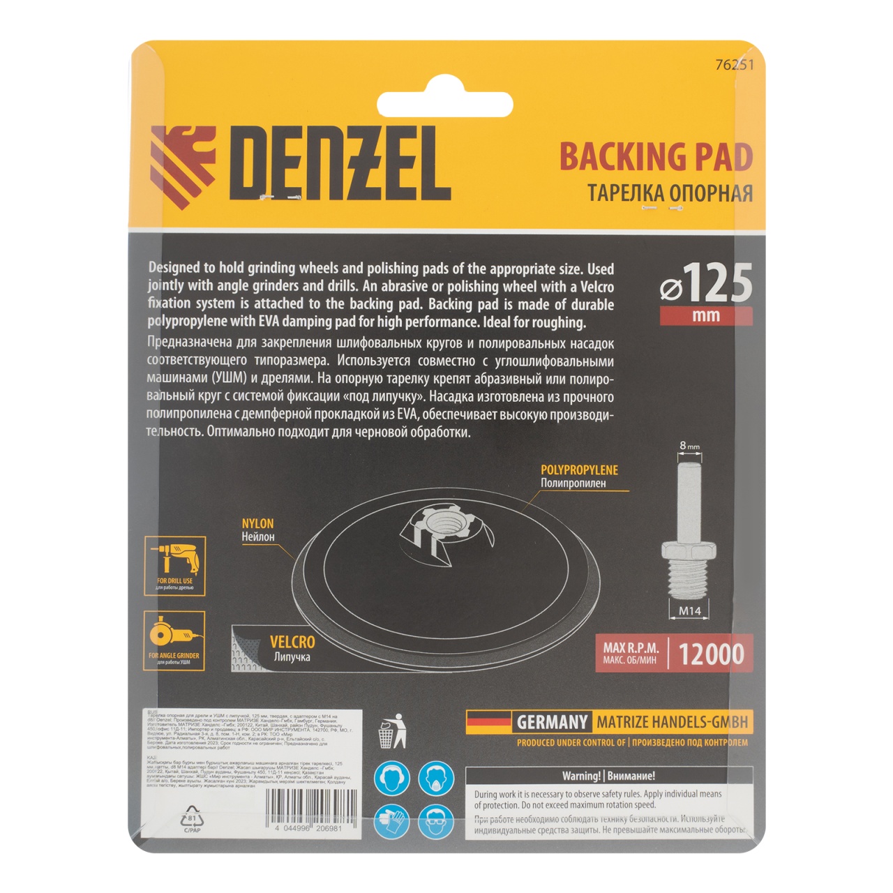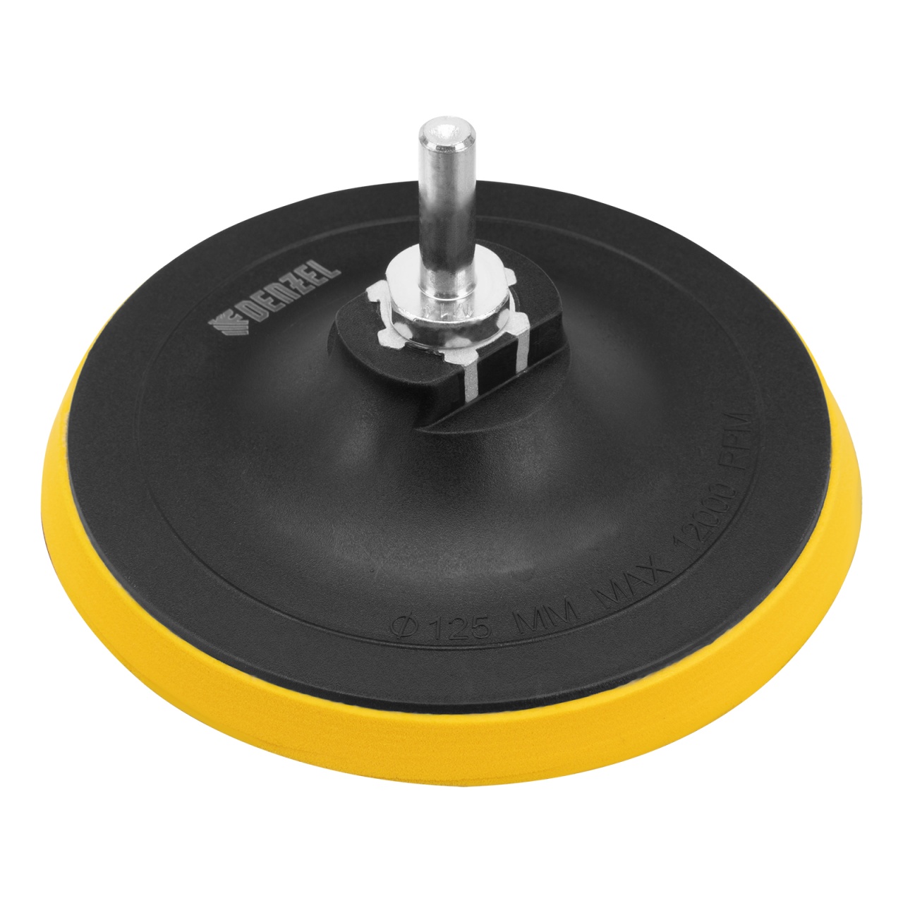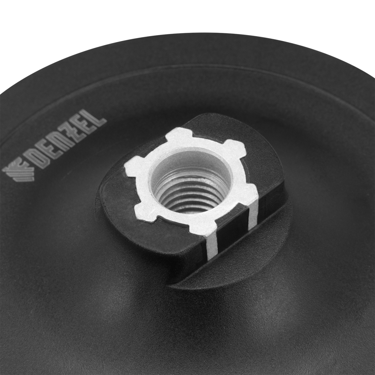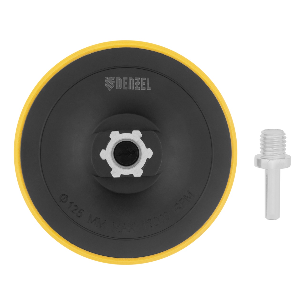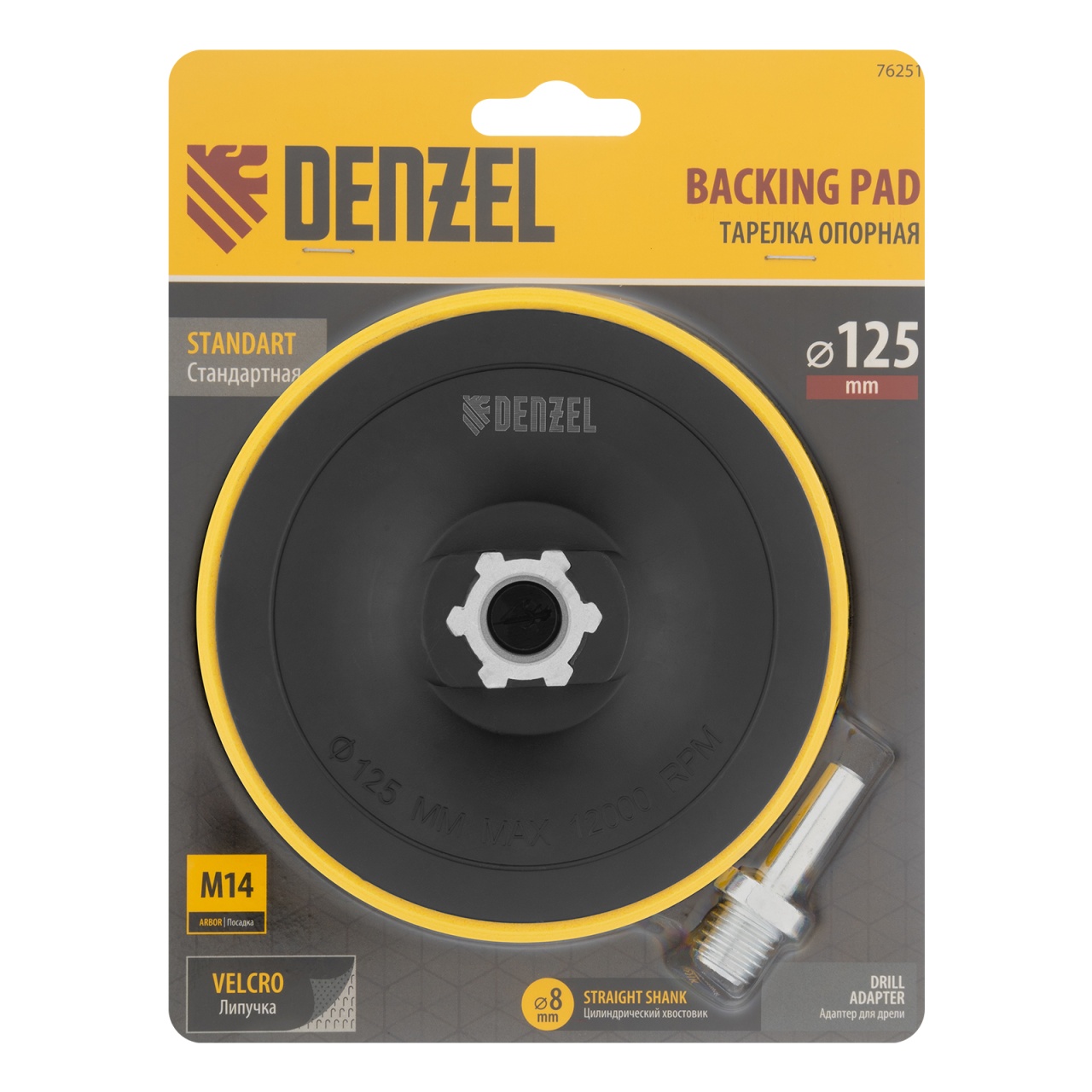 Тарелка опорная Denzel 76251 диаметром 125 мм, с липучкой и адаптером с М14 на d8, стандартная, устанавливается на дрель или углошлифовальную машину (УШМ). Используется для крепления абразивных или полировальных кругов на ворсовой основе, позволяет подготовить поверхность для дальнейшей обработки или придать ей финишную гладкость.