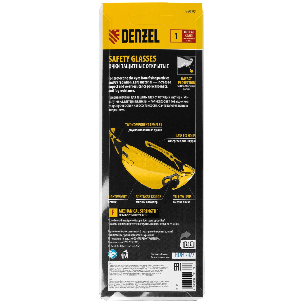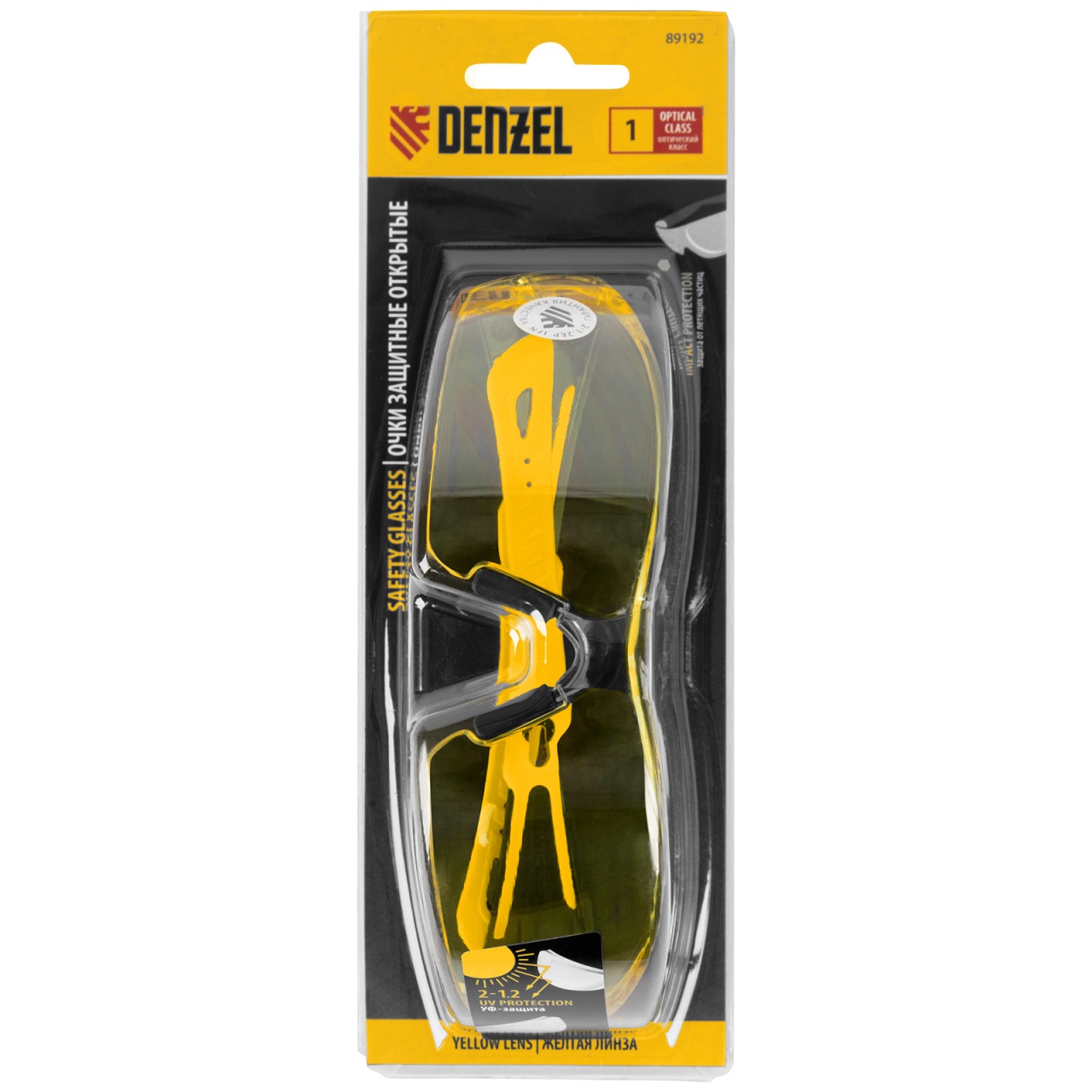 Легкие универсальные защитные очки открытого типа Denzel 89192 с поликарбонатными жёлтыми линзами и 2-компонентными дужками предназначены для защиты глаз от механических повреждений и УФ-излучения. Очкам присвоен класс механической прочности F, они обеспечивают защиту от высокоскоростных частиц с низкоэнергетическим ударом V=45 м/с. Очки используются во время работы с электро- и бензоинструментом, на производстве и в быту.