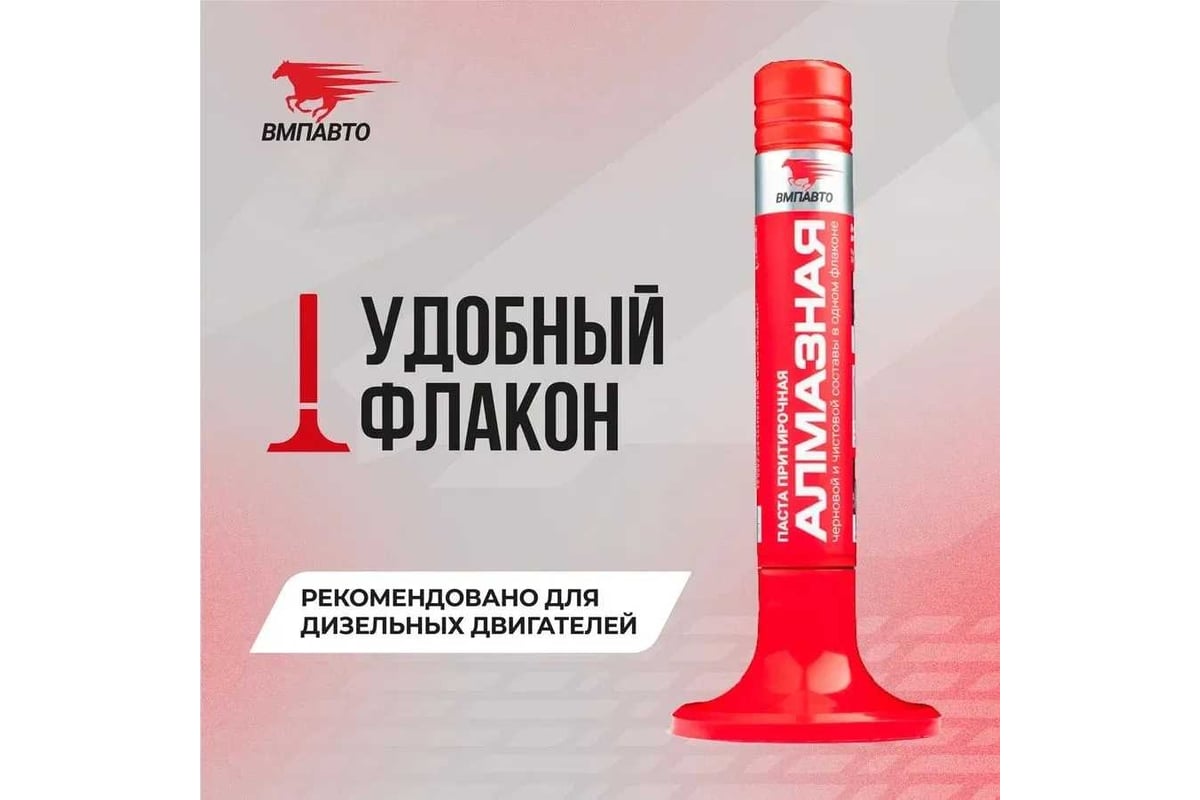 ПРИТИРОЧНАЯ ПАСТА ДЛЯ КЛАПАНОВ Паста притирочная АЛМАЗНАЯ кирпичного цвета, содержит абразив, приближенный по твердости к алмазу. Применяется для дизельных, а также деталей с высокой твёрдостью. Уникальный состав пасты 2 в 1 (черновой и чистовой) является функциональным преимуществом. Черновой состав притирки — крупнозернистая паста с размером зерна 80 мкм — подготавливает поверхность к следующему этапу микрошлифования.