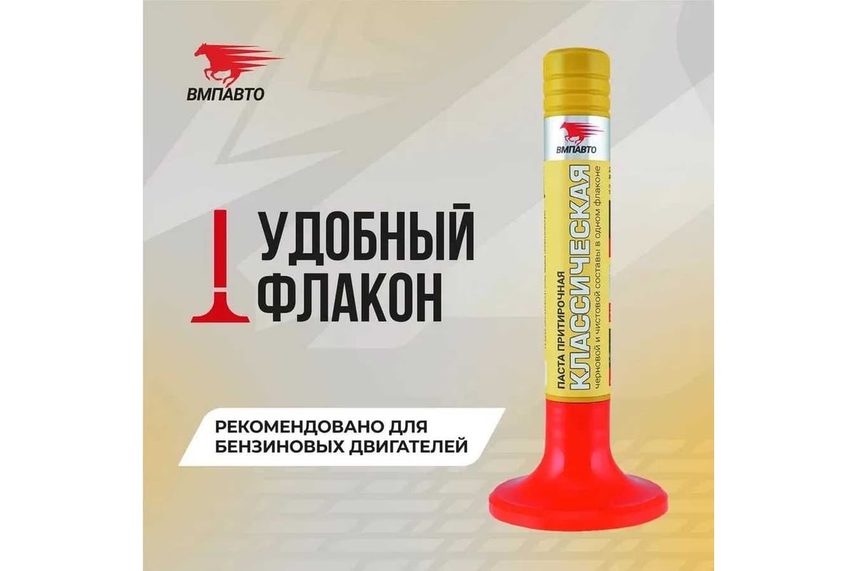 ПРИТИРОЧНАЯ ПАСТА ДЛЯ КЛАПАНОВ Притирочная паста ВМПАВТО «Классическая» — применяется для бензиновых двигателей и других трущихся деталей. Паста не выходит из зоны притирки и поэтому постоянно измельчается, проходя все стадии черновой и чистовой обработки. Это не только сокращает время притирки и расход продукта, но не допускает попадание пасты на направляющие и стержни клапанов.