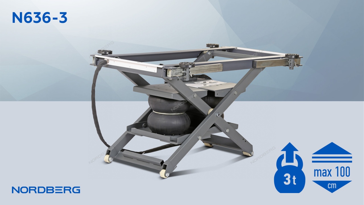 Ножничный мобильный подъемник NORDBERG N636-3 – компактное и удобное подъемное оборудование для подъема автомобилей до 2 тонн, предназначенное для профессионального и бытового использования в автосервисах, студиях детейлинга, шиномонтажных мастерских, гаражах и на автосервисных предприятиях. Подъемник, сделанный по типу складной конструкции, управляется при помощи пневмобаллона, что обеспечивает плавное и точное поднятие и опускание автомобиля, а также помогает контролировать высоту подъема. Мобильный подъемник может полностью заменить классический двухстоечный подъемник благодаря возможности подключения к нему воздушного шланга компрессора. Ножничный подкатной пневмоподъемник NORDBERG N636-3 позволит максимально эффективно и быстро выполнить широкий спектр работ по детейлингу, шиномонтажу, диагностическому осмотру автомобилей, кузовному ремонту и пр.