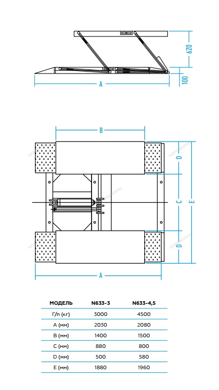 Универсальный подъемник для шиномонтажных мастерских и зоны приемки, может использоваться и как мобильный, без фиксации к полу, так и закрепленным на стационарном посте NORDBERG N633-3B
