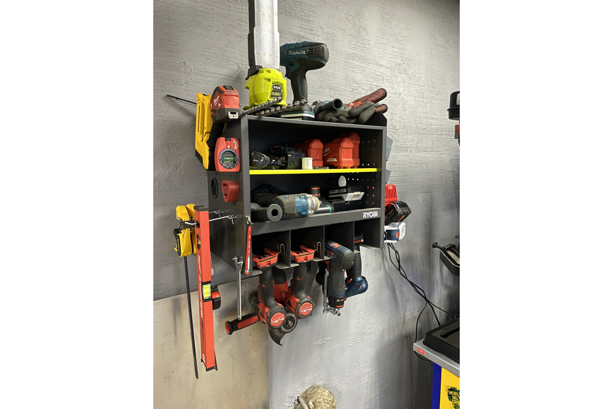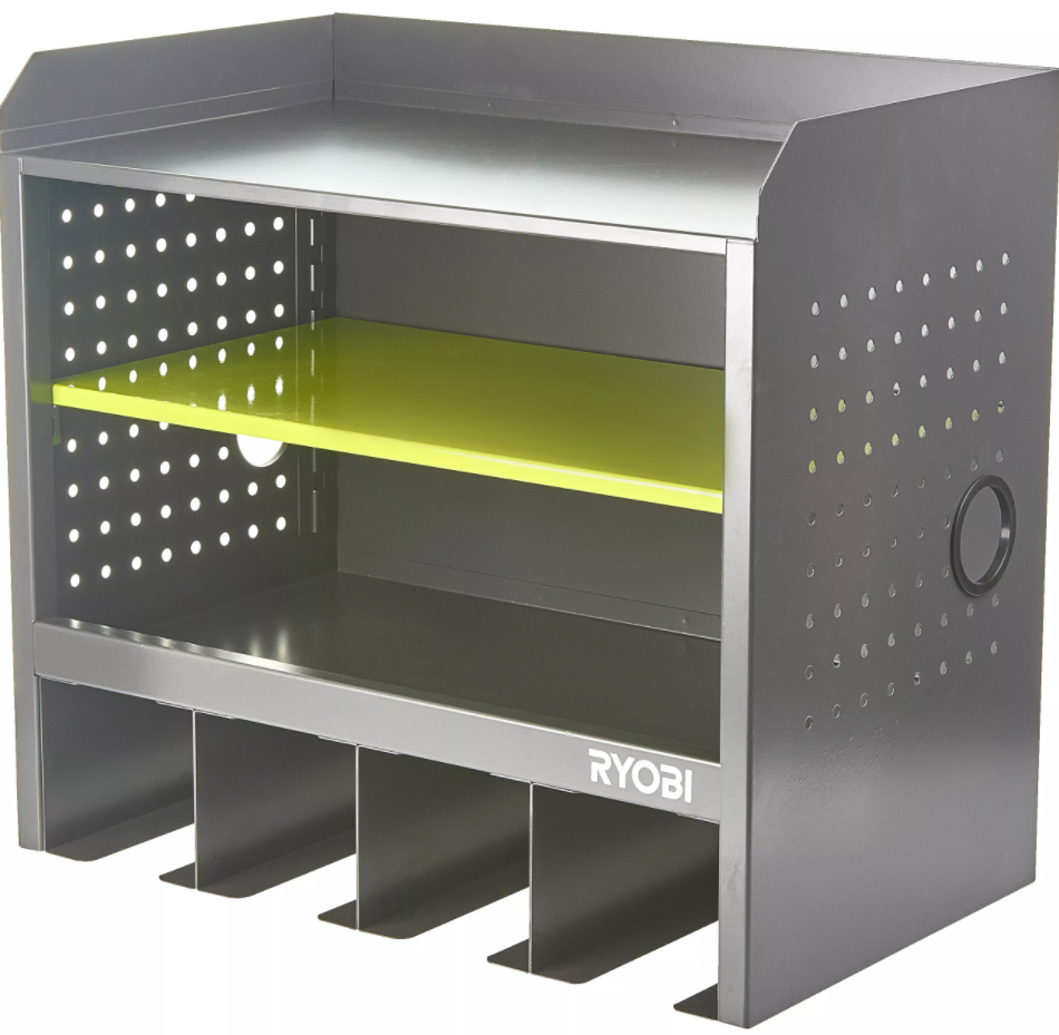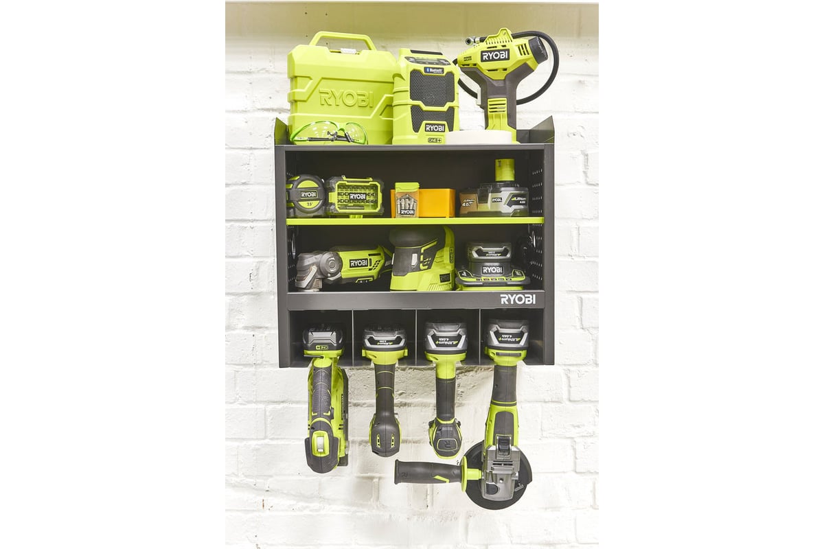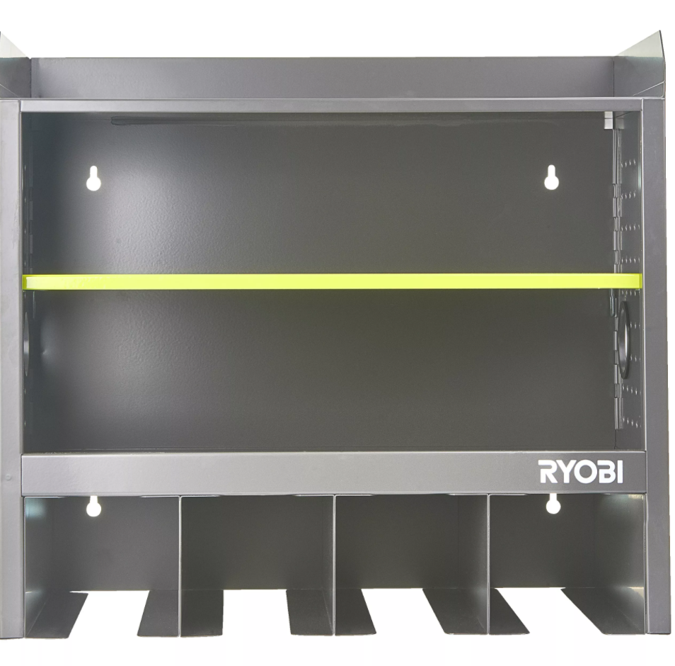 Открытая навесная полка Ryobi RHWS-02 5132004359 служит для хранения инструмента, расходных материалов и рабочего инвентаря. Конструкция подвешивается на стену в мастерской или гараже. В боковых стенках предусмотрены отверстия для вывода проводов.