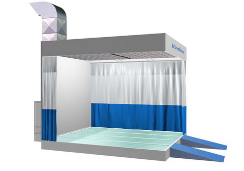Зоны подготовки автомобилей имеют вытяжной блок с фильтрами очистки воздуха, пленум с осветителями и ПВХ шторы по периметру зоны.