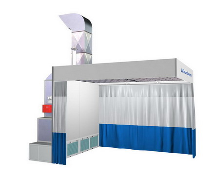 Зоны подготовки автомобилей имеют вытяжной блок с фильтрами очистки воздуха, пленум с осветителями и ПВХ шторы по периметру зоны.