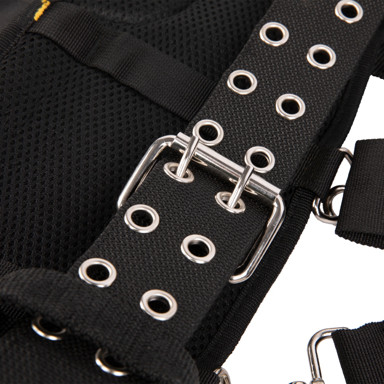 - Ремень (1450 мм) с множеством отверстий обеспечивает ступенчатую регулировку длины (ременная пряжка с двойным язычком и два ряда отверстий с металлическими люверсами).