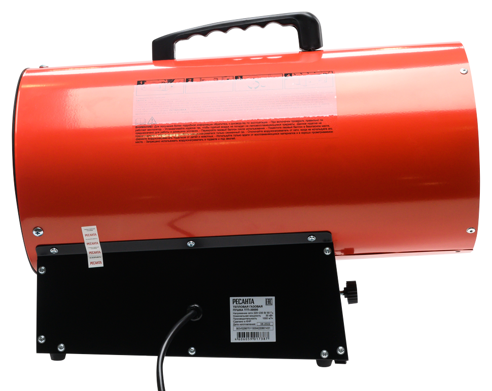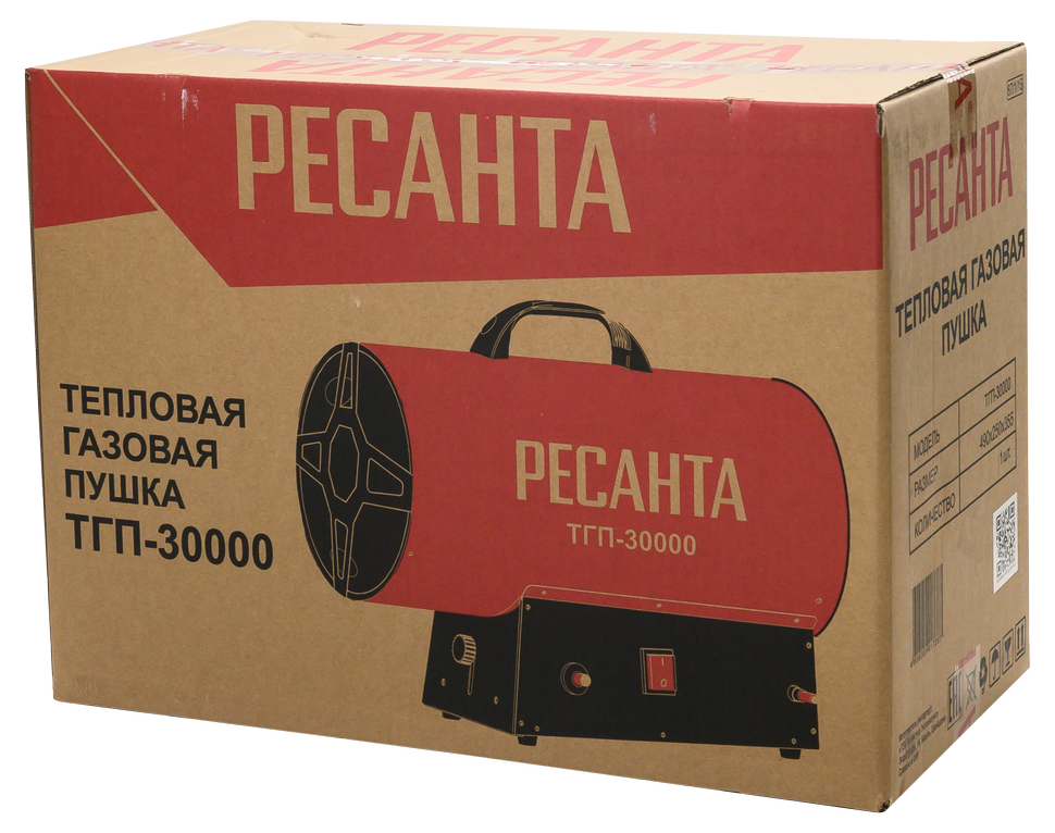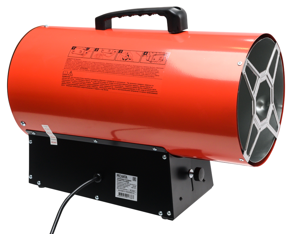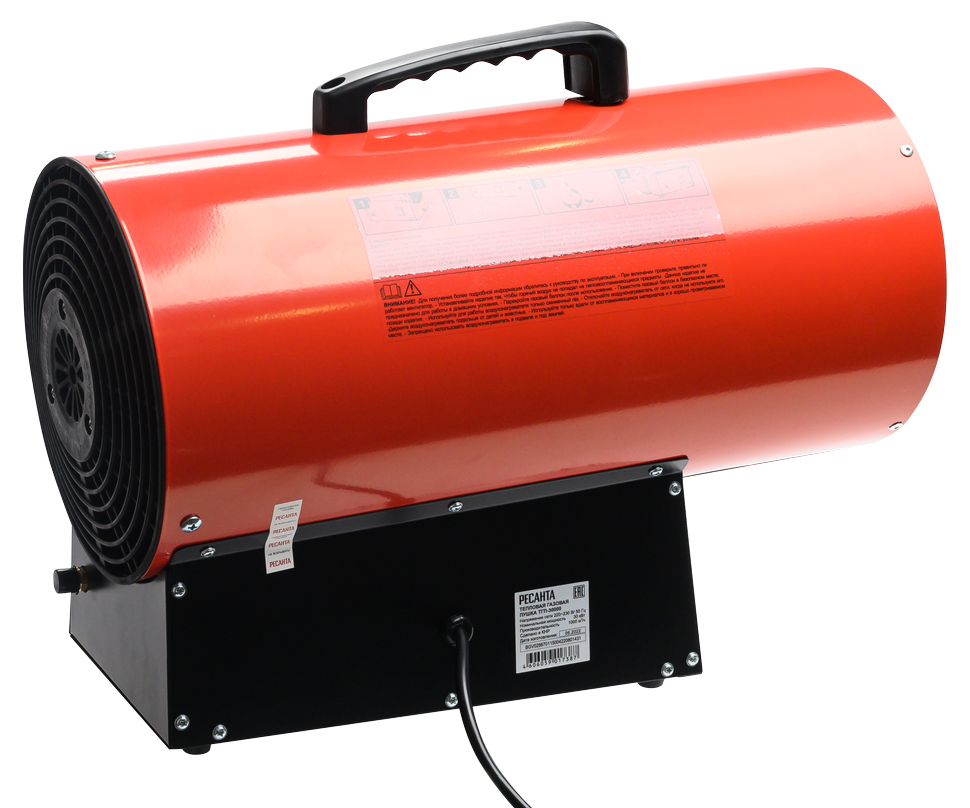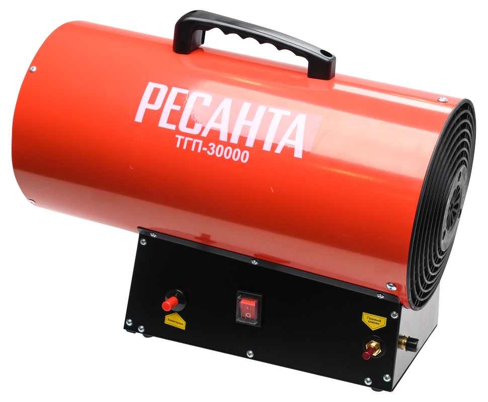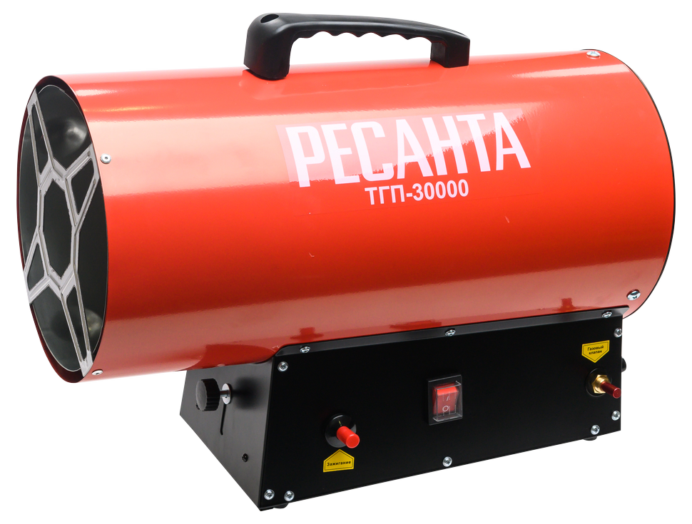 Газовая тепловая пушка РЕСАНТА ТГП-30000 – воздухонагреватель, работающий на сжиженном газовом топливе. Топливо необходимо для получения горячей атмосферы в камере сгорания, а электроэнергия, подводимая к устройству, необходима для питания вентилятора, нагнетающего воздух, и для функционирования автоматики. Газовые пушки прямого нагрева являются простой и надёжной конструкцией без дымохода, где горячий воздух из устройства поступают в помещение.