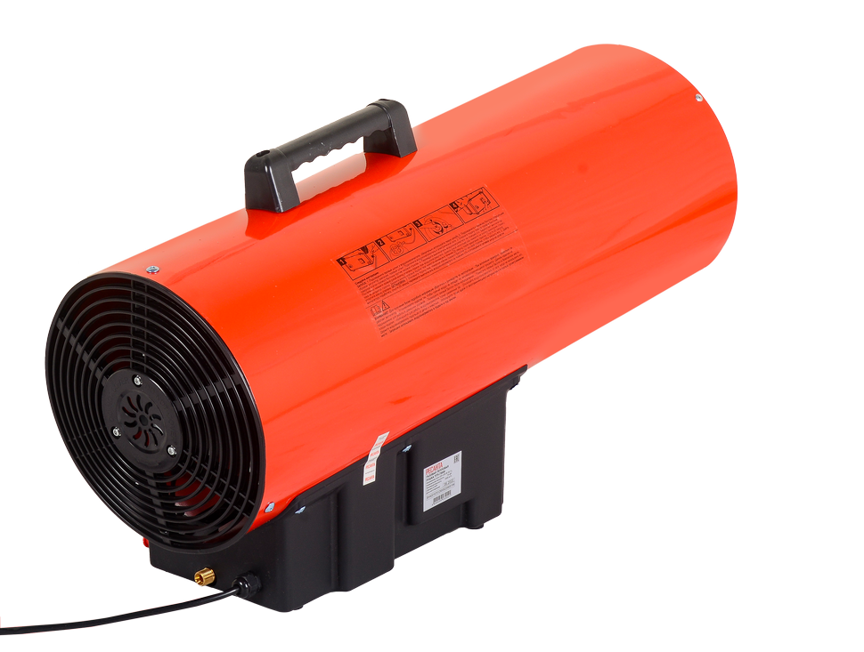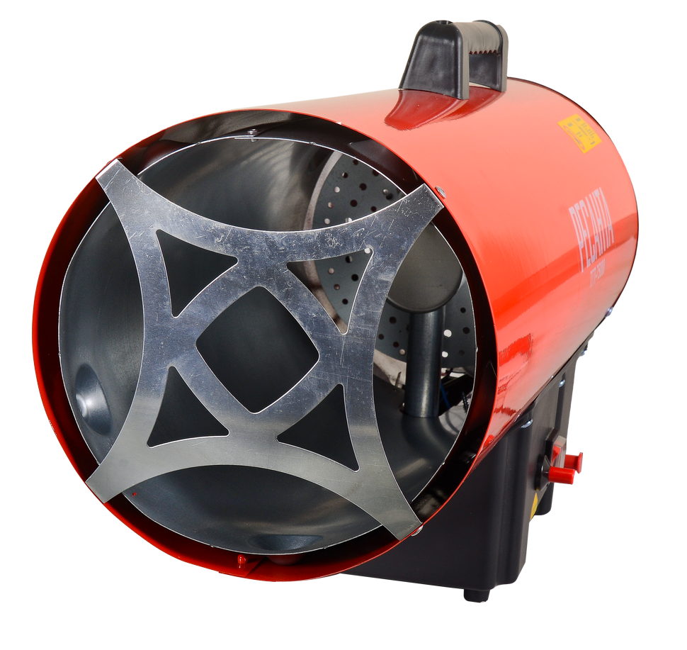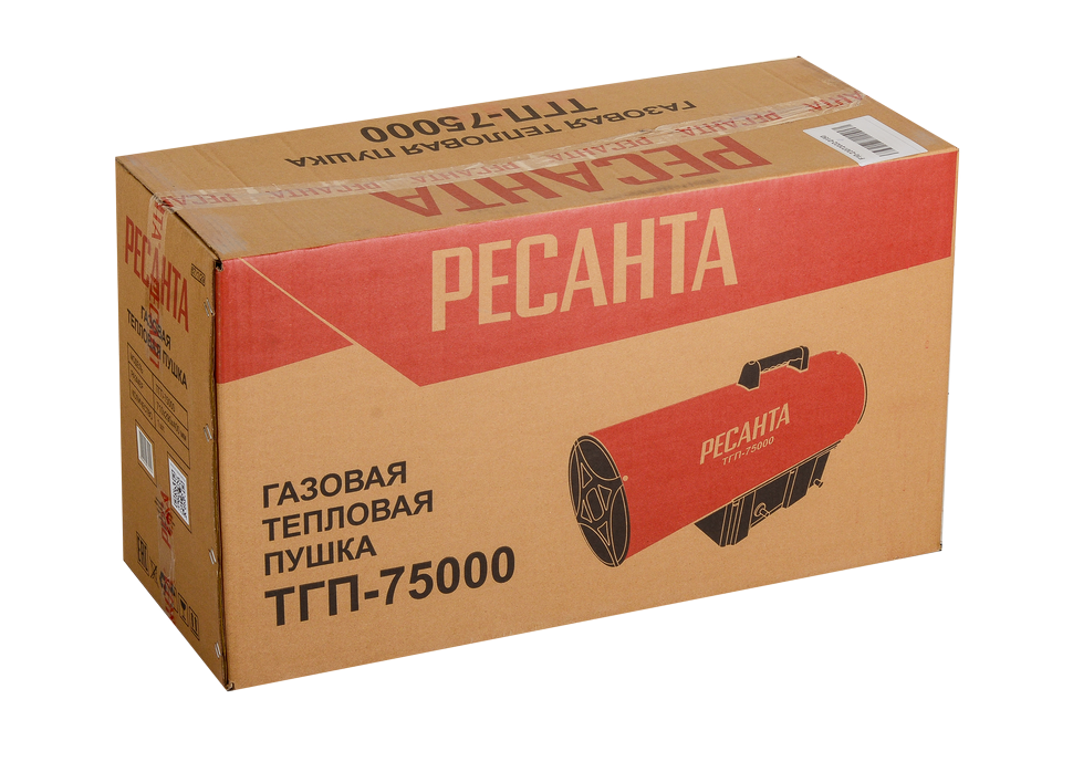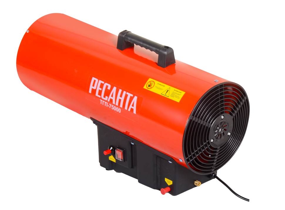 Газовая тепловая пушка РЕСАНТА ТГП-75000 – воздухонагреватель, работающий на сжиженном газовом топливе. Топливо необходимо для получения горячей атмосферы в камере сгорания, а электроэнергия, подводимая к устройству, необходима для питания вентилятора, нагнетающего воздух, и для функционирования автоматики. Газовые пушки прямого нагрева являются простой и надёжной конструкцией без дымохода, где горячий воздух из устройства поступают в помещение.