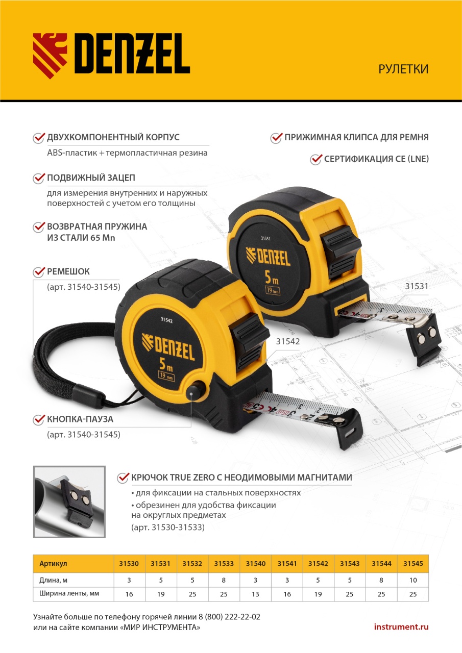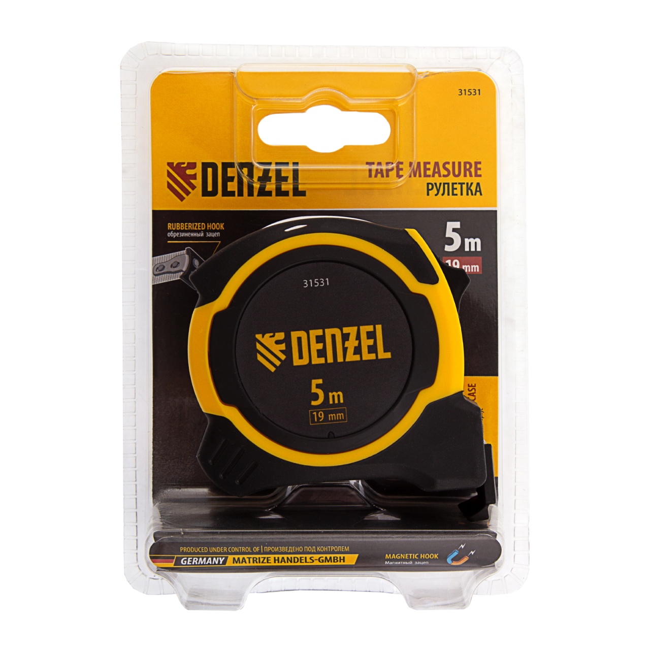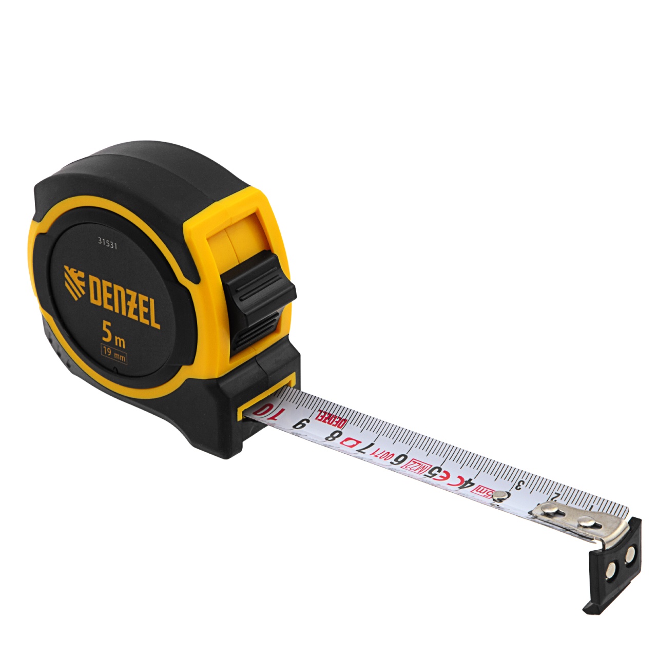 Рулетка Denzel 31531 в двухкомпонентном корпусе, с измерительной лентой шириной 19 мм и магнитным обрезиненным зацепом, позволяет определять размеры предметов и расстояния до 5 м. Широкая упругая лента упрощает проведение измерений в труднодоступных местах. Рулетка будет полезна во время строительных, ремонтных и различных бытовых работ.