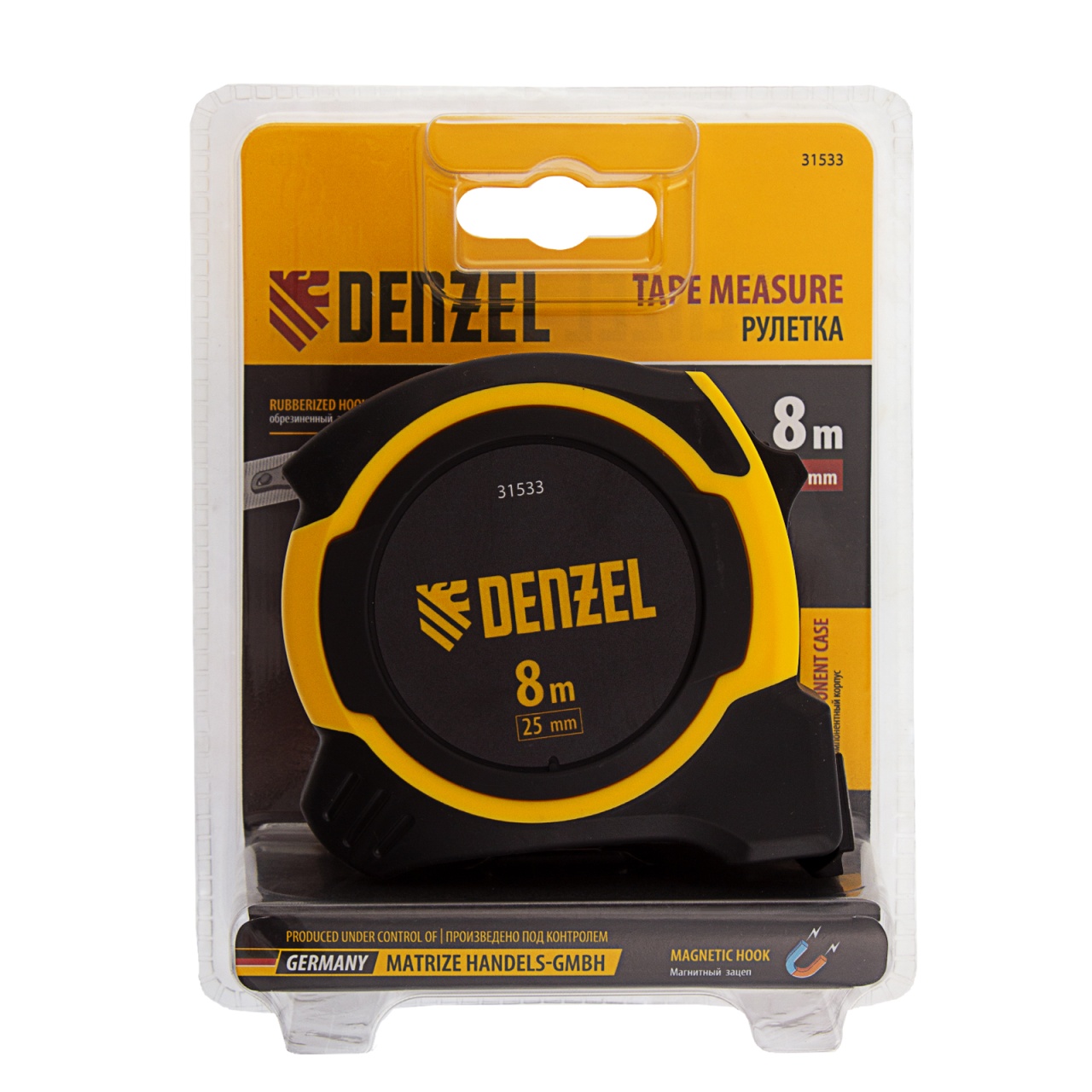 Рулетка Denzel 31533 в двухкомпонентном корпусе, с измерительной лентой шириной 25 мм и магнитным обрезиненным зацепом, позволяет определять размеры предметов и расстояния до 8 м. Широкая упругая лента упрощает проведение измерений в труднодоступных местах. Рулетка будет полезна во время строительных, ремонтных и различных бытовых работ.