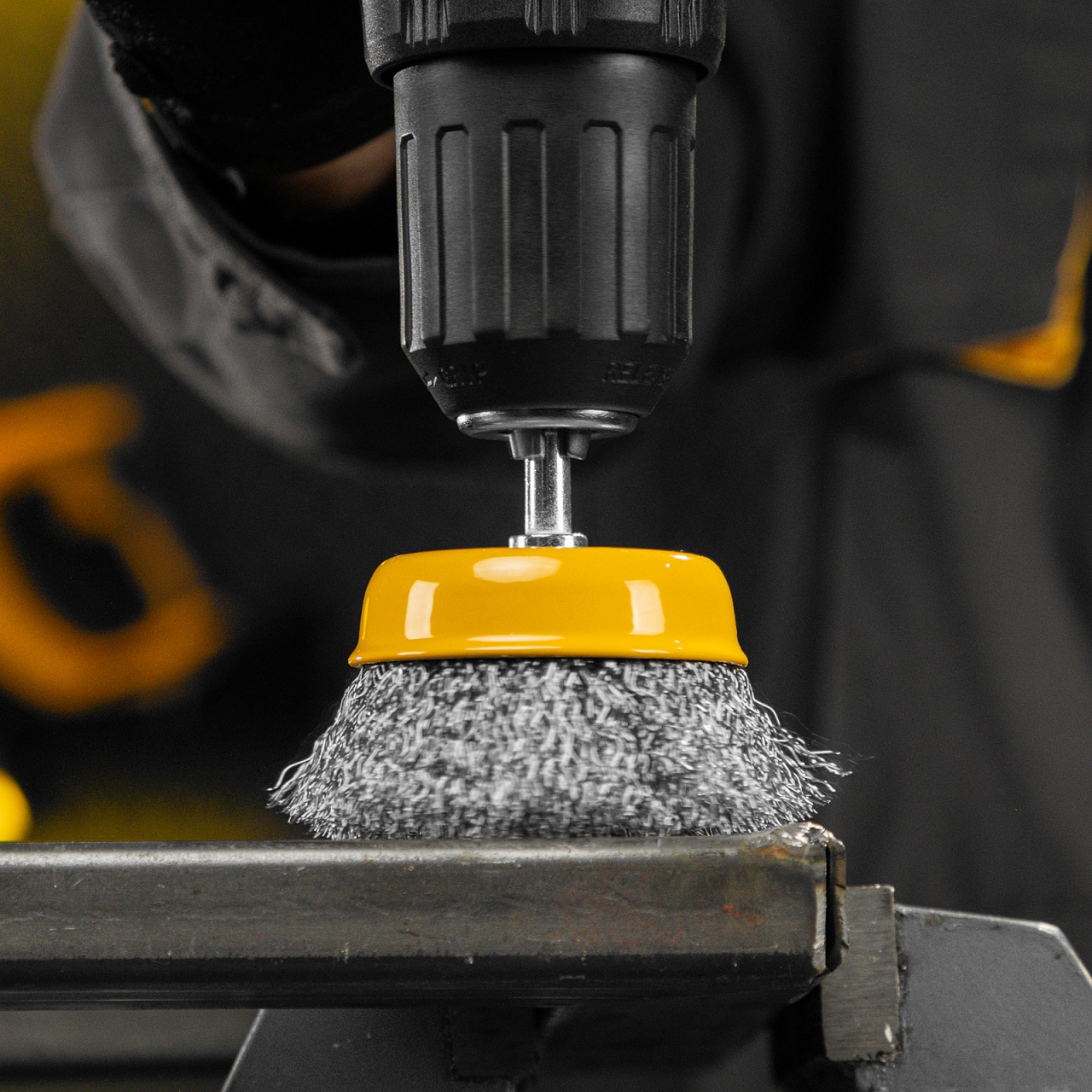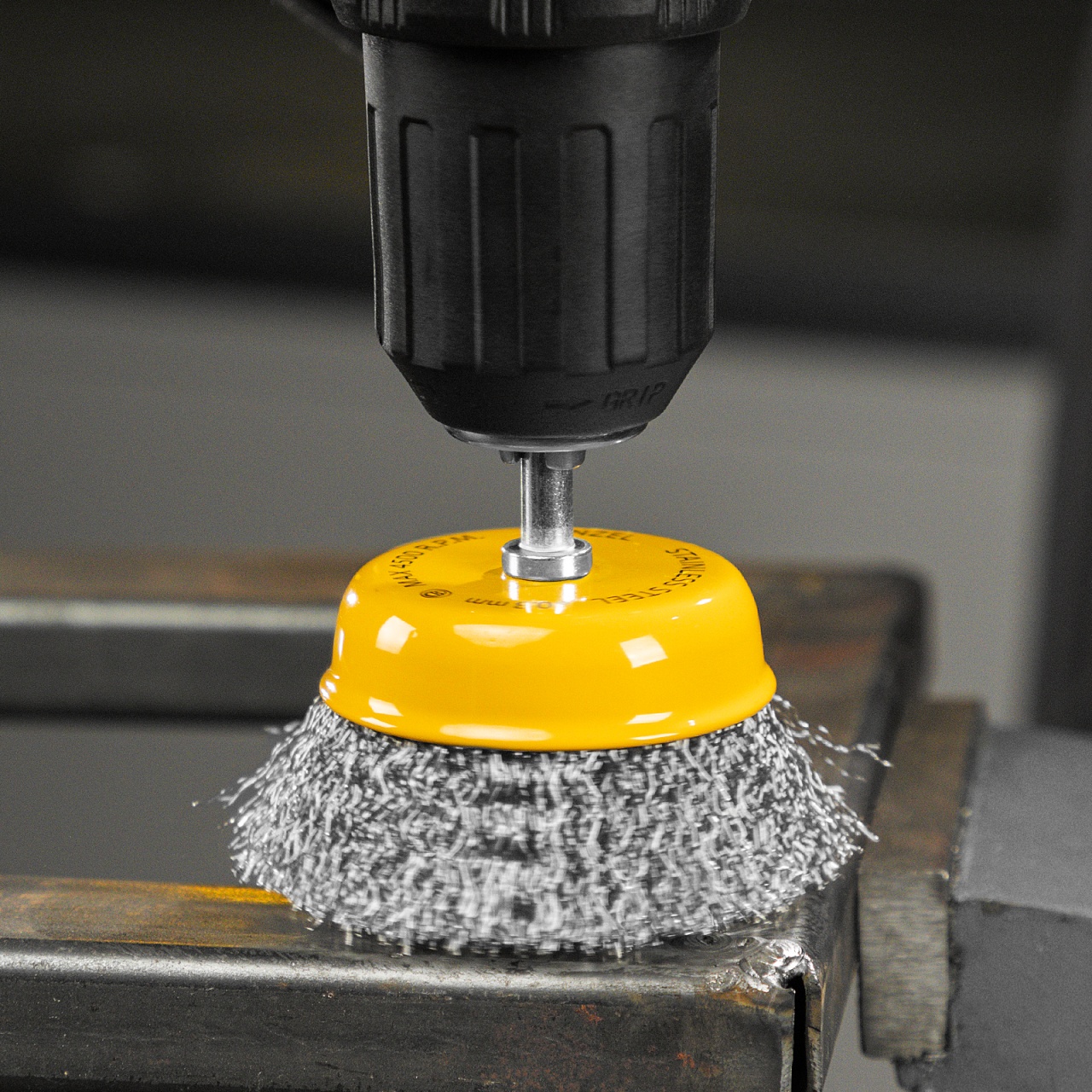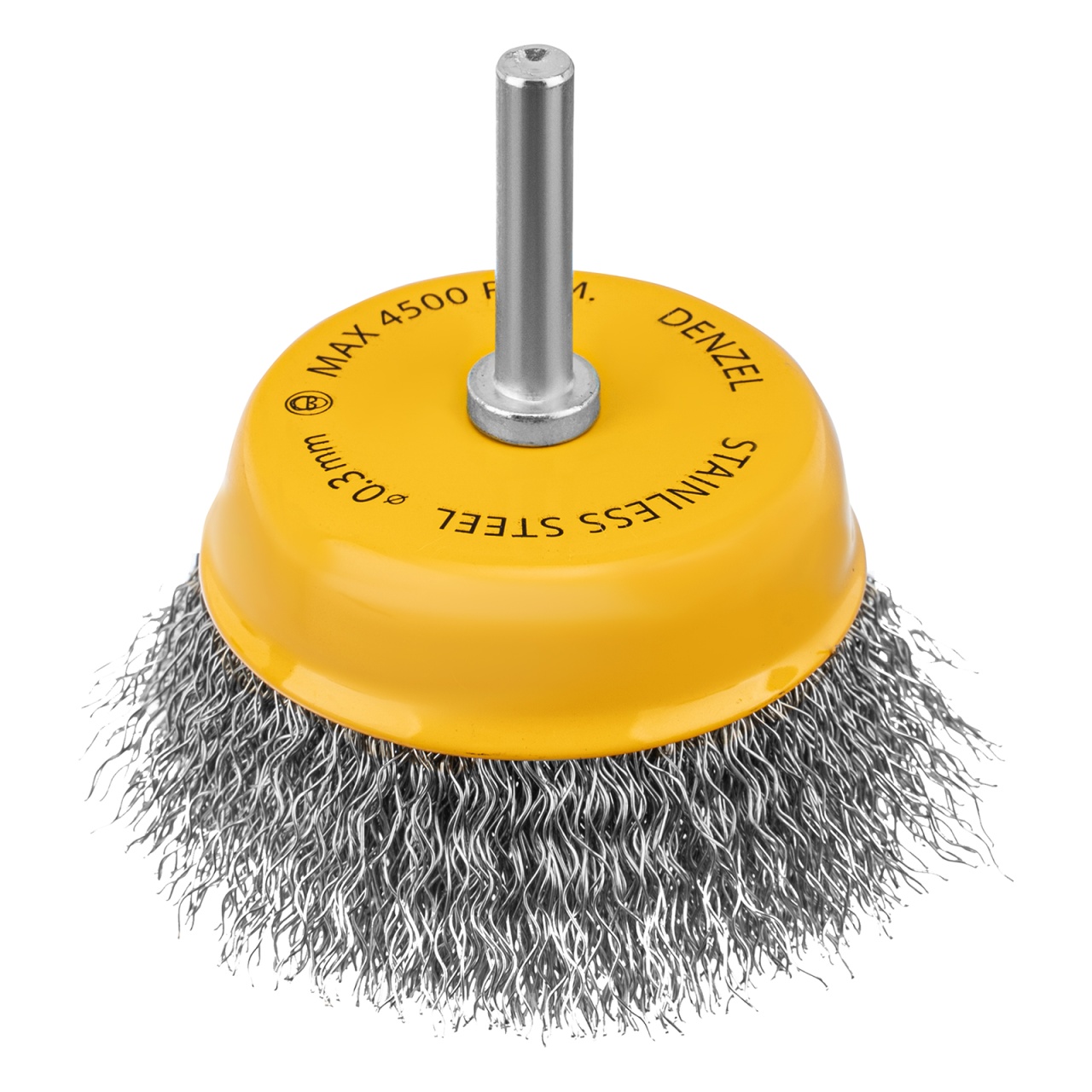 Щетка для дрели «Чашка» Denzel 744773 диаметром 75 мм, со шпилькой и щетиной из нержавеющей витой проволоки, используется для щадящей обработки плоских твердых поверхностей из металла, древесины, пластика, идеально подходит для нержавеющей стали. Оптимальна для снятия тонкого слоя старой краски, ржавчины, удаления загрязнений. Имеет хвостовик диаметром 6 мм и устанавливается в патрон дрели или прямошлифовальной машины (ПШМ).