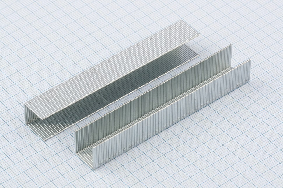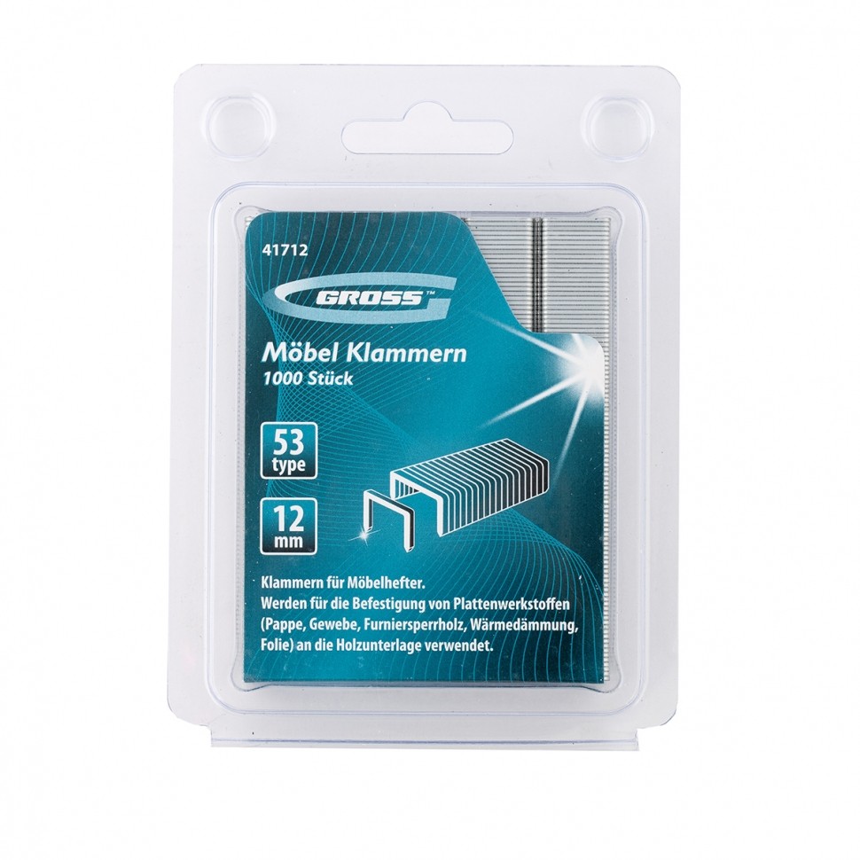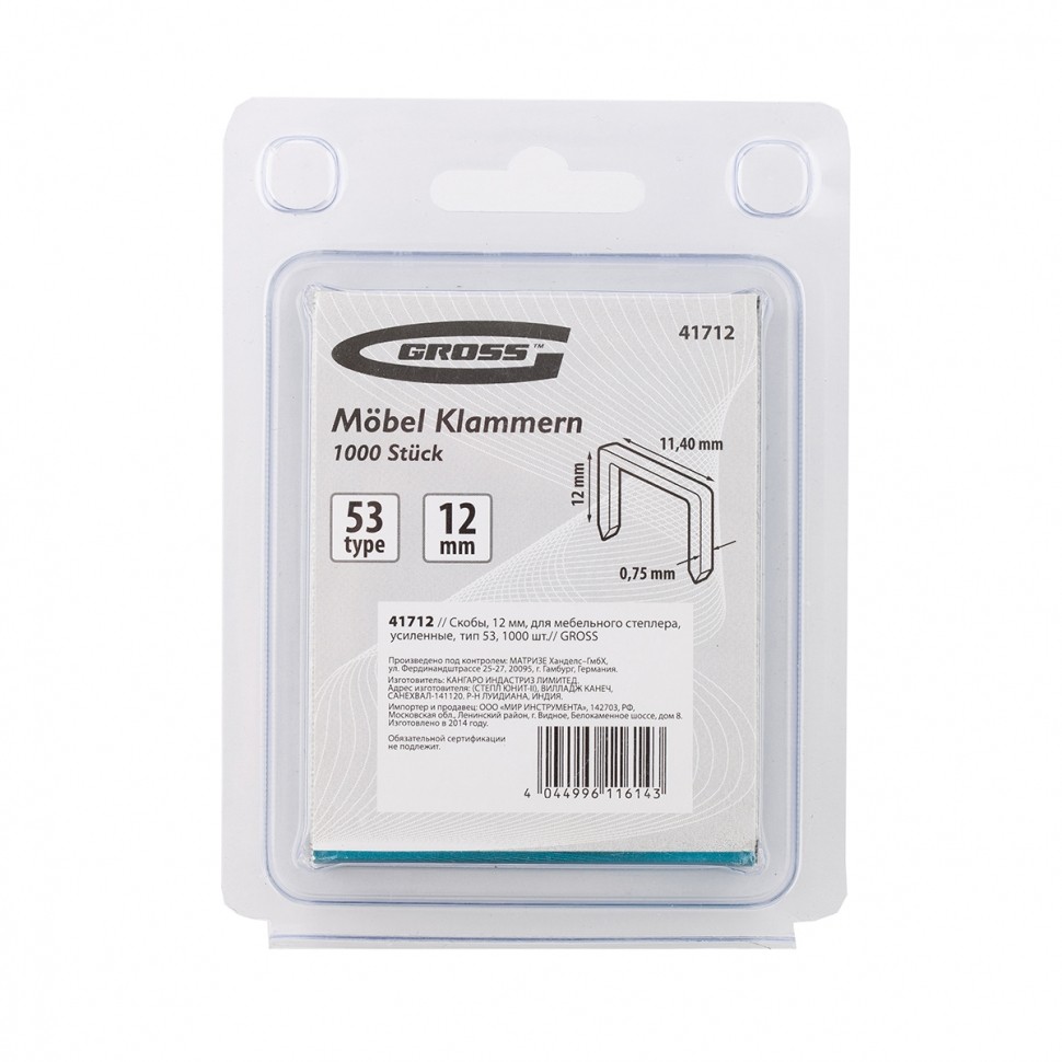 Усиленные скобы Gross 41712 размером 12 х 11,4 х 0,75 мм, тип 53, 1000 шт. в упаковке, предназначены для скрепления листовых материалов с помощью мебельного степлера. Позволяют зафиксировать картон, фанеру, ткань в ходе проведения облицовочных или ремонтных работ.